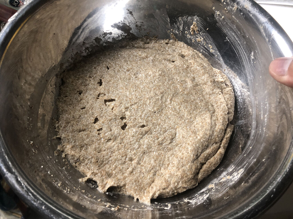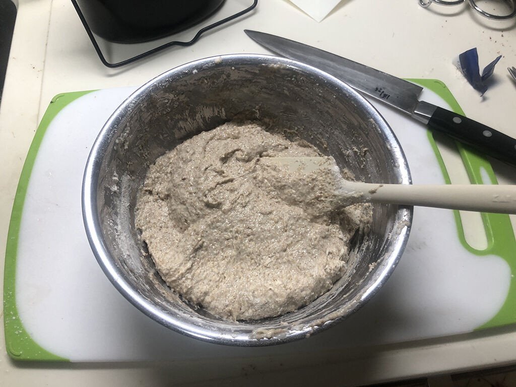 そこで、自分も毎回出る捨て種を捨てずに貯めておいて、それでパンを作る事にしました。具体的には、コミスブロートのサワードウの分量が貯まったら、それにライ麦粉の代わりに強力粉を入れて、ライ麦粉と強力粉が半々くらいの、いわゆるミッシュブロートにしようという訳です。