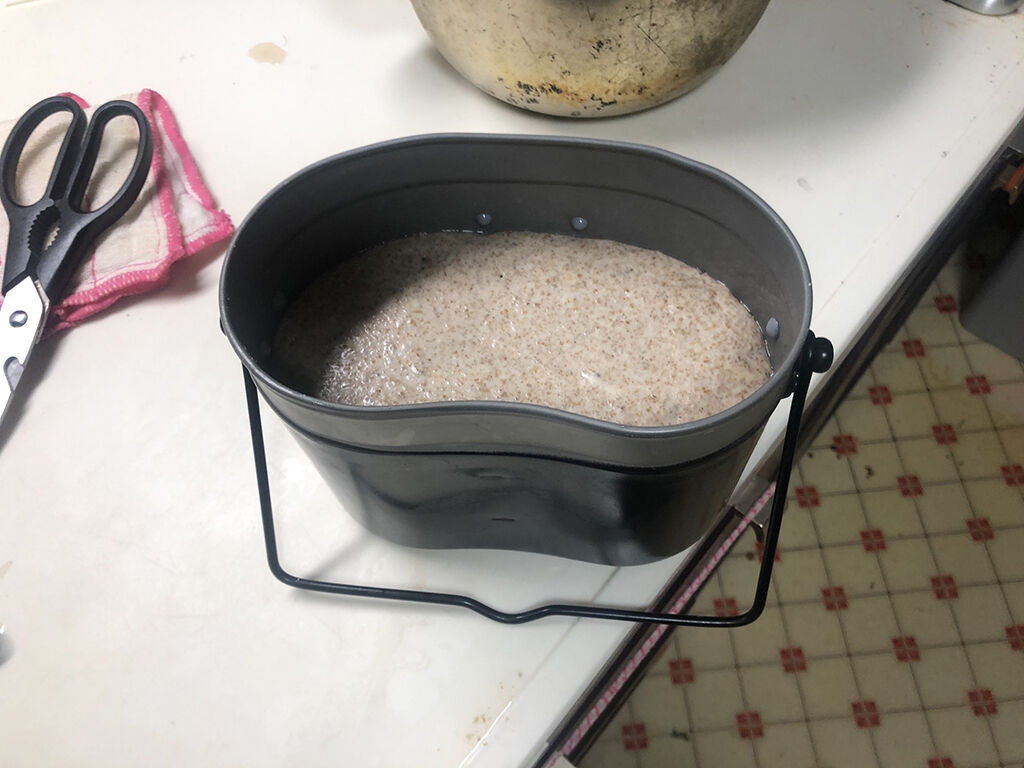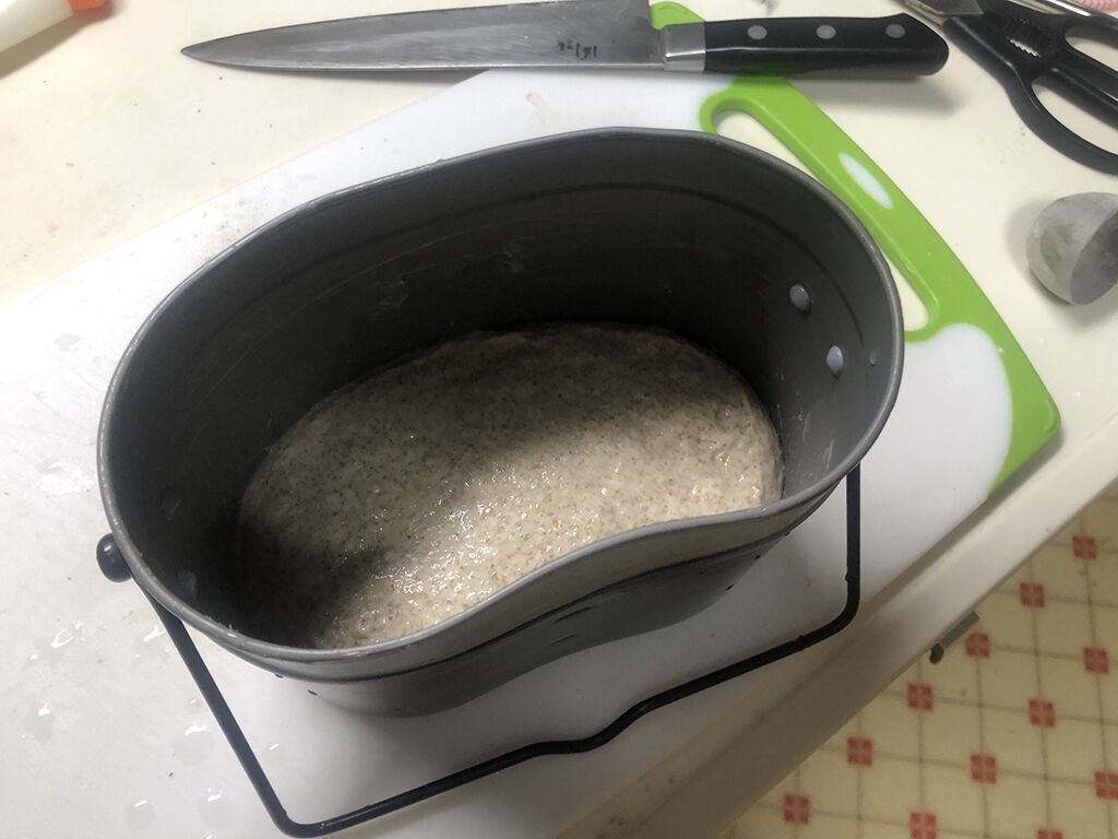 ところが起きてみてびっくり。生地が飯盒から溢れかえっていました。とりあえず、残ってる生地をまとめなおし、改めて35度で1時間発酵させて、180度で30分焼いてみましたが、いい感じに焼きあがりました。しかも、味の方はほんの少し酸味があって、こないだ作ったのよりは、よりライ麦パンっぽくなっていました。