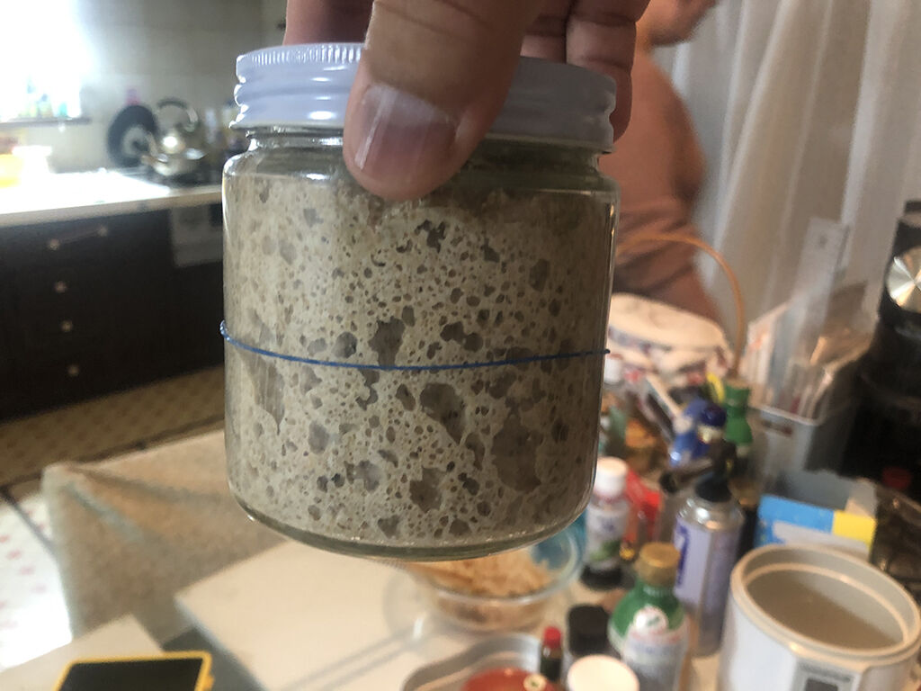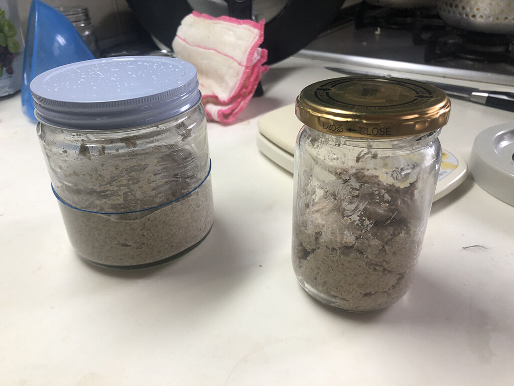 捨て種の保存の仕方は、煮沸消毒した瓶に入れて、冷蔵庫に放り込むだけ。当初は、これで再び使う時に発酵して嵩が増えるのか心配でした。ところが、2日間くらい冷蔵庫に入れてたくらいではどういう事はなくて、いざ使う際に冷蔵庫から出しておいたら、そこから再びムクムクと発酵し始めました。