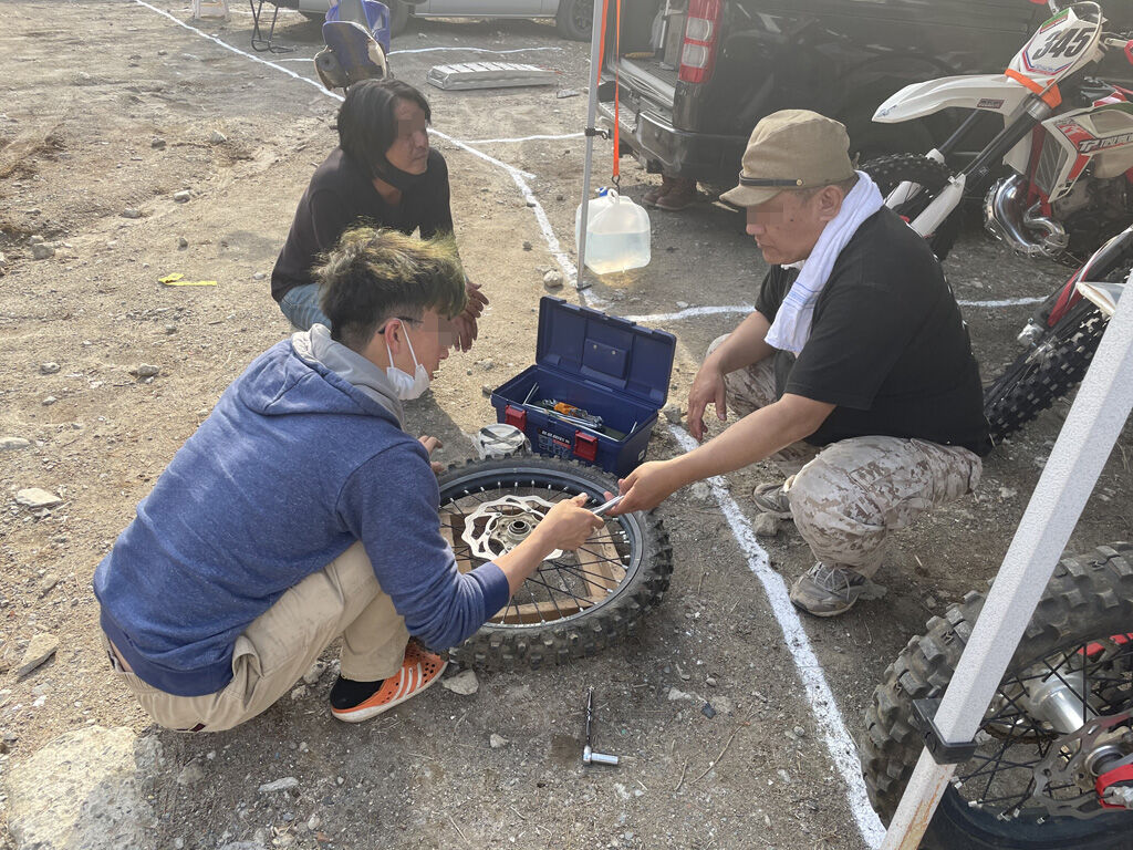 天気は例によって例のごとく、前日はとってもピーカン。でも予報では、本番当日は雨の予報。一応、曇りのち雨という事にはなってましたが、勝沼ではそういう時は朝から雨だと思っておいて間違いないです。となると、タイヤの空気圧が重要になってきます。一応、タイヤは今回、前後ともミシュラン・エンデューロの新品で、前はミディアム、後ろは去年発売されたエクストリームに交換してきました。ドライコンディションなら、前が6,後ろは5くらいにセットするのですが、途中から雨が降ってチュルチュルになるのを想定して、前後とも3に落としました。まぁ、空気圧が低くてもドライは走れますが、チュルチュルだと高いままでは走れないからです。(途中で落とす前に大抵こけますし)