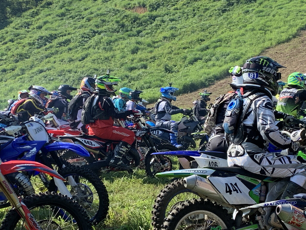 いよいよスタート。前日降った雨がどれだけコースに影響与えてるか心配でしたが、全く影響がなさそうです。何でも、下の駐車場の方は降ったけど、上のゲレンデの方はほとんど降ってないとの事。田舎にありがちな天気だった様です。スタート方式はWEXもJNCCも同じヘルメットタッチスタート。そして今回もみんなよりちょっと出遅れてスタート。もっとも、慌てて出ても先の方で詰まってたりするので、のんびり出発しました。
