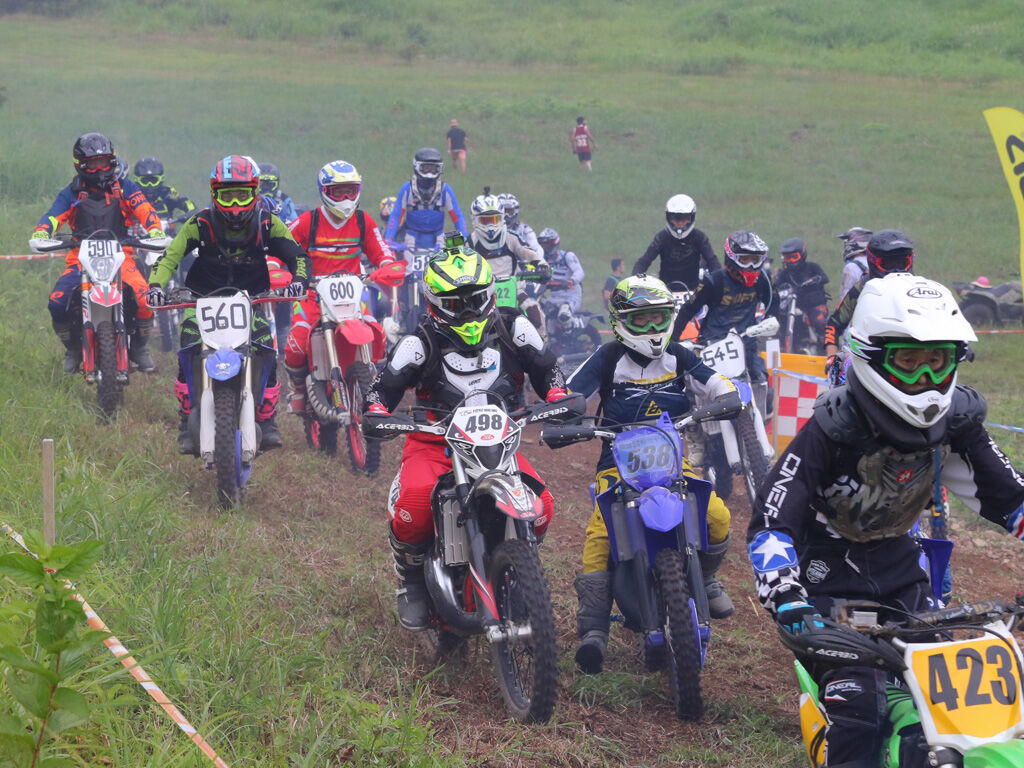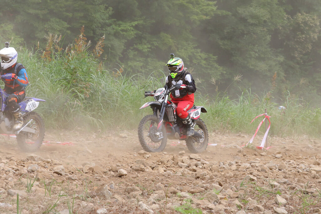というのも、JNCCでCOMPクラスが相当に路面を荒らしてて、自分が走ったFUNクラスとは比較にならないほど、ガレ場も降りも路面が荒れていました。そこへ持ってきて、前回以上に乾燥が進んでいて、砂埃で前が相当見えづらくなっており、さらに言えば、こう言っては失礼なんですが、JNCCのFUNと比べるとWEX90のライダーレベルは若干劣るのか、ガレ場で引っかかる人が格段に多く、自分なりの走りがしにくい状況でした。