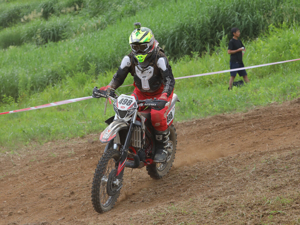 さて、前回のレースではボケっとしててずっと雨モードで走っていたのですが、神立の様なゲレンデでは晴モードの方がパワフルかつクイックに走れるのではないか、という事。そして前日のセクションスクールでは、ガレ場から晴モードで走ってみました。確かにガレ場ではちょっとコントロールしにくい所があったのですが(というのも、前走者がいてもたつく事が多かったから)、ダートでは極めて強力に走る事が確認でき、これなら晴モードの方が良さそうだ、と感じました。