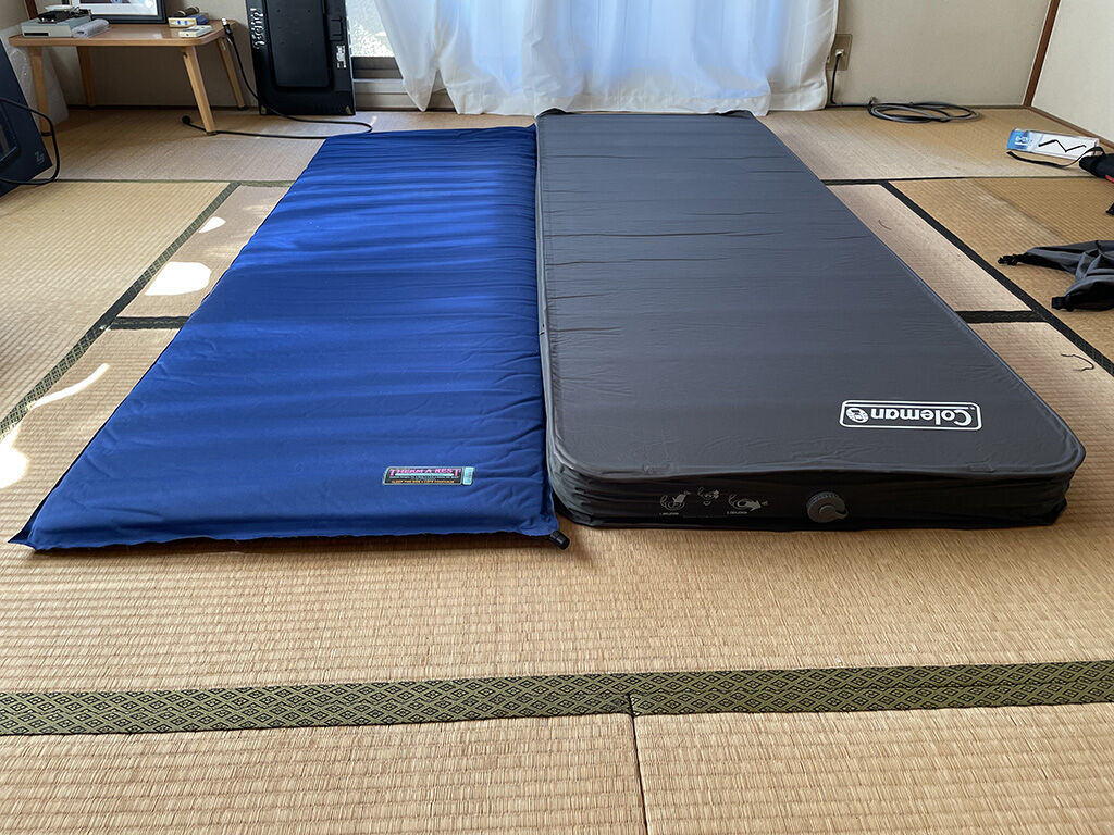 サーマレスト・ベースキャンプもそれまで使ってたマットの中では分厚い部類で5cmありますが、コールマンのキャンパーインフレーターマットハイピークはさらに分厚くて、10cmの厚みがあります。大きさはベースキャンプがLサイズで63×196cmですが、キャンパーインフレーターマットはシングルで68×198cmと横幅が5cm大きいです。実はベースキャンプは自分が寝ると両肩が少し落ちる感じだったのですが、キャンパーインフレーターマットはそんな寝心地の悪さがありません。重さはベースキャンプが1.53kgに対してキャンパーインフレーターマットは2.7kgでやや重たいですが、持った感じではそれほどの差は感じませんでしたし、輸送はトランポで行いますので問題になりません。