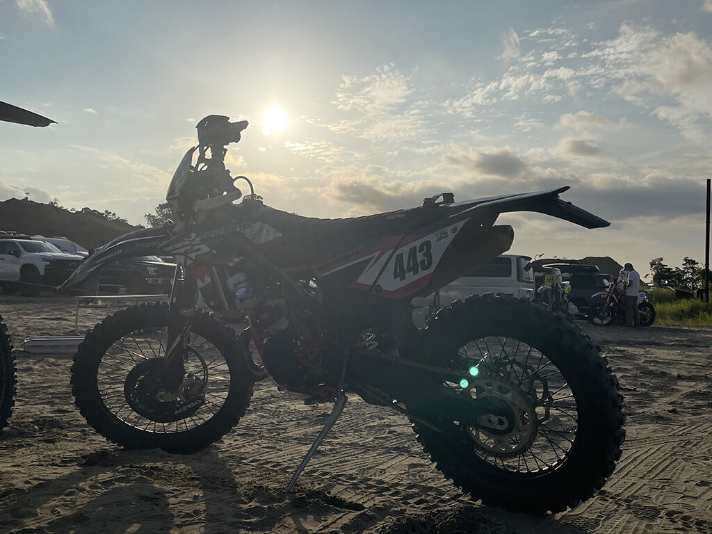 その事がわかるにつれ、徐々にアクセルを開ける様になってきました。特筆すべきは、タイヤの空気圧を0.1にしていた事。エンデューロレース、特にツルツルの時にタイヤの空気圧を落とすのは、タイヤを潰して接地面を増やす事でグリップ力を向上させる目的があるのですが、ザクザクのサンドの場合は空気圧を上げてタイヤを潰さず砂に突き刺す様にするのが効果的である事が体感できました。逆に空気圧が低いと、突進力が低下して直進しないという訳です。