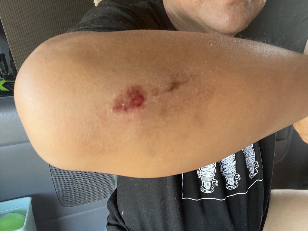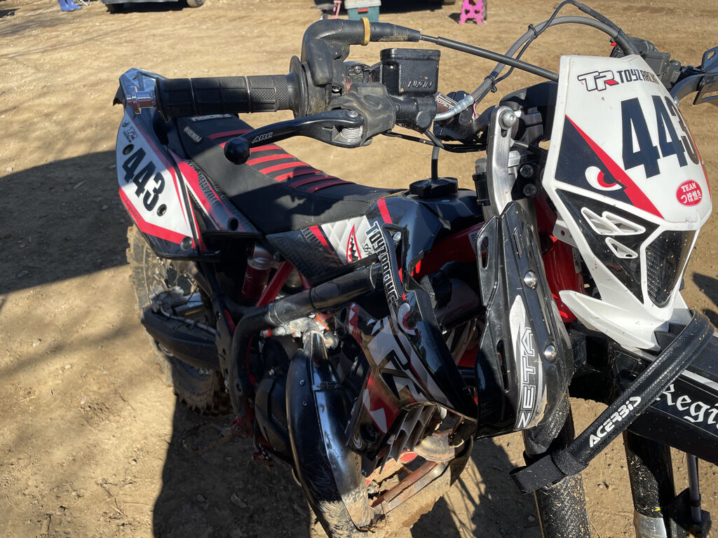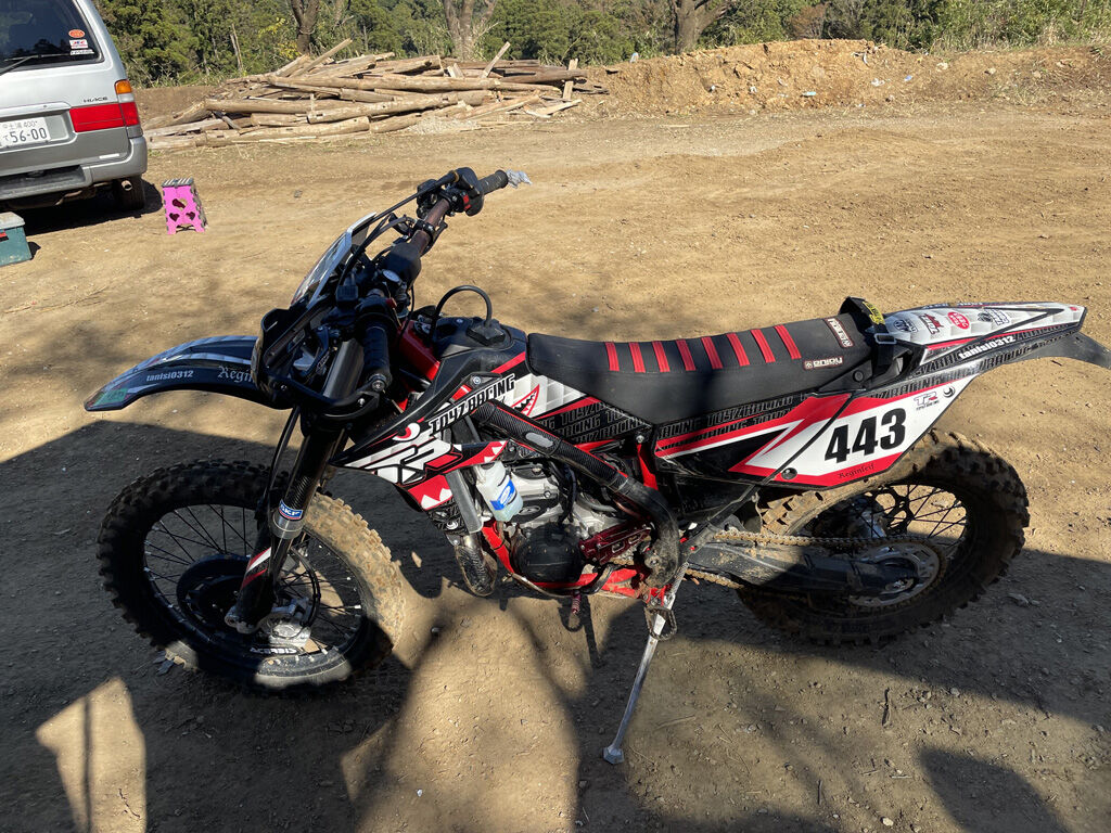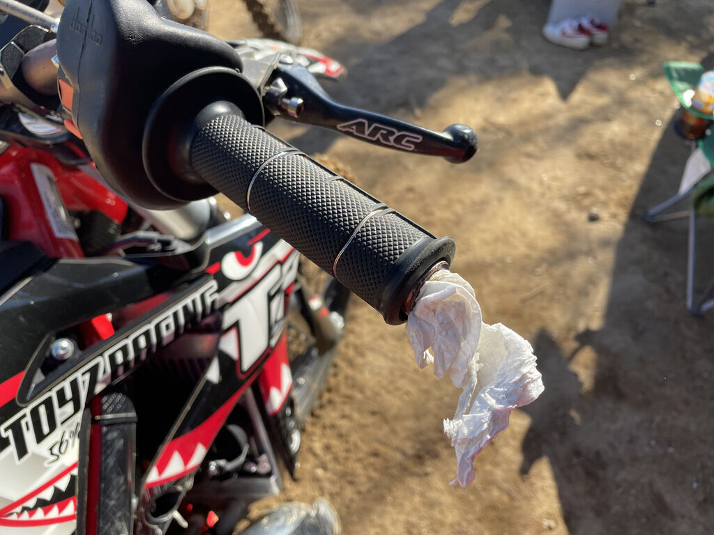 そんな感じでご機嫌に走ってたのですが、40分くらいの時、初級のMXコースのダラダラコーナーでいきなりフロントが滑って右肩から地面に叩きつけられました。こういう事があるから肩の装甲のないチェストプロテクターは着けられません。肩だの肘(のプロテクターはつけてなかった)は痛いけど、走れん事はありません。こないだ付け替えたばっかりのハンドガードの右が少し上向いてましたが、そのまま走行を続けました。