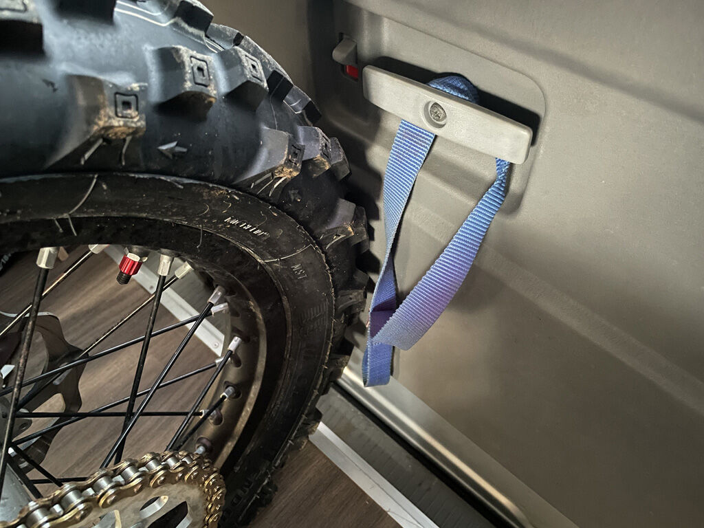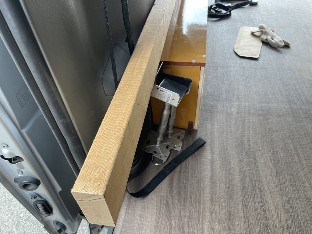 そして最近では、バイクのフロントタイヤをリアシートに押し付けて固定する際、リアシートが破損しない様に寝板をリアシートに当てて保護する様にしているのですが、その用途に使うにしても寝板の形が無駄で、リアシートの横幅をカバーするには寸足らず、それでいてタイヤの当たらないシートの上の方まで板がきてる、という感じです。ついでに言うと、寝板がリアシートから離れない様にラッシングベルトを絞ると、寝板がシートの内側に凹んで行って、タイヤがリアシートの端に当たるという不具合もあります。