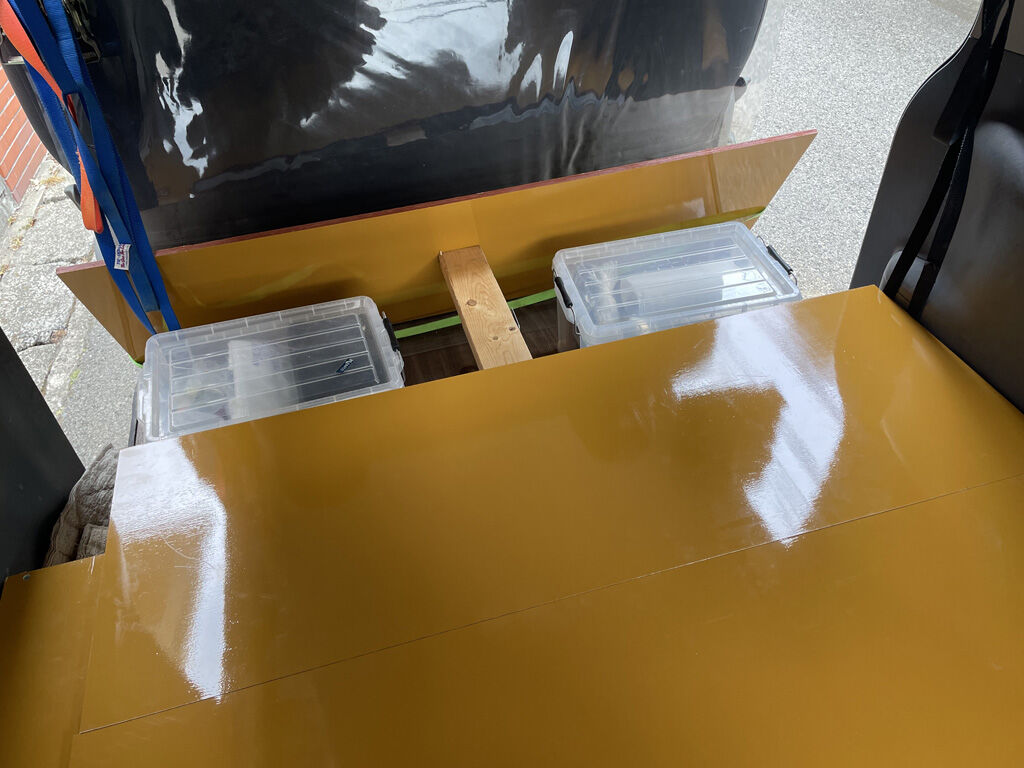 寝板は田型から目型に変更したのですが、そのサイズをリアゲートから通せるサイズにしました。これにより前の寝板よりも1枚あたりの重さが軽くなり、かつ荷室への積み込みもしやすくなりました。これが可能になったのは、タイヤハウス収納を設けたからで、寝板と荷室の壁に隙間があっても全然気になりません。また十分マチもあるので、強度的にも問題ありません。