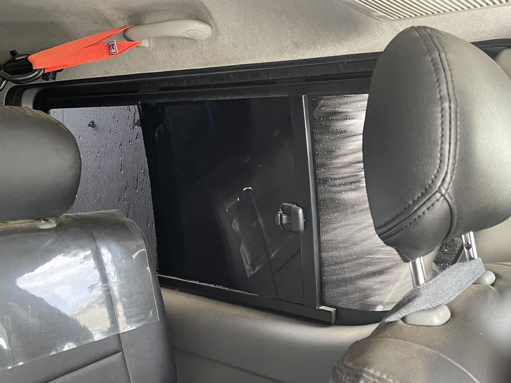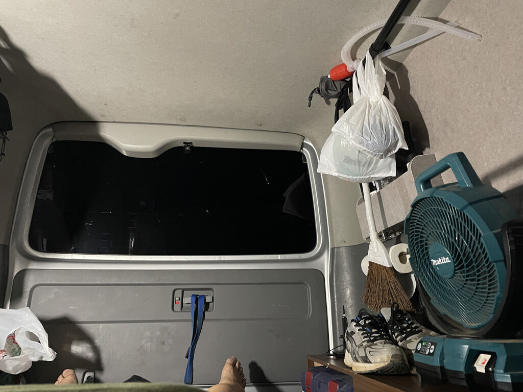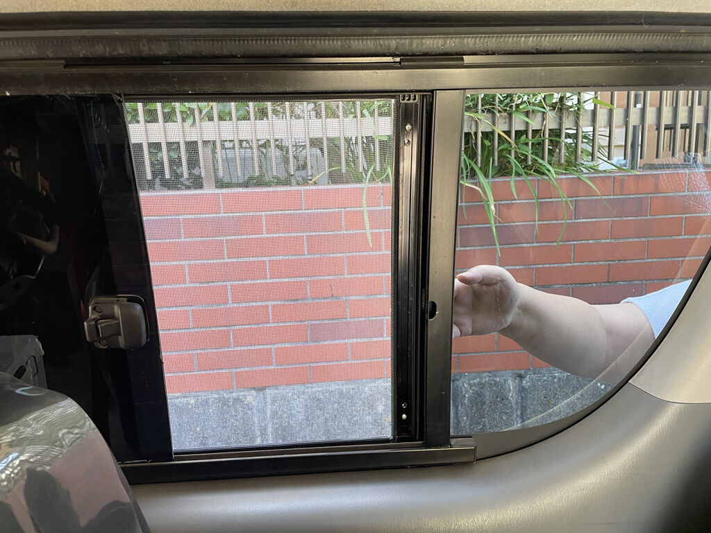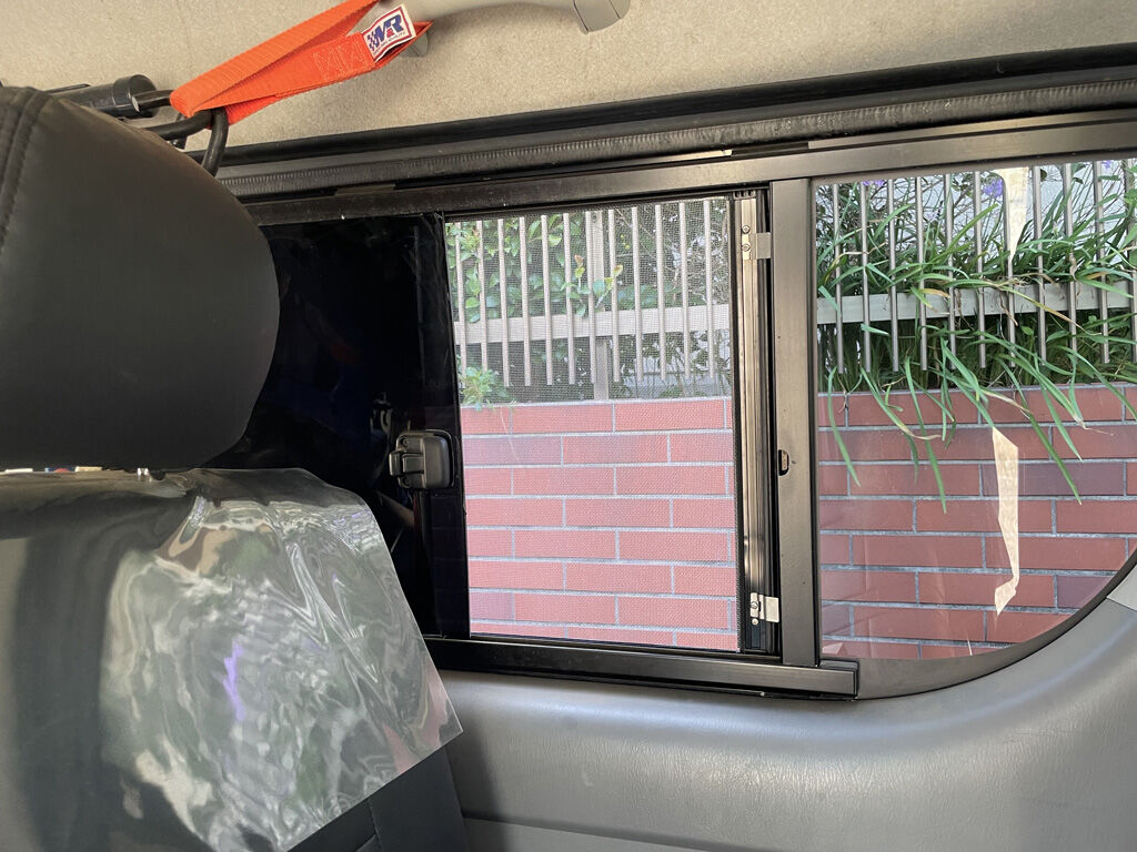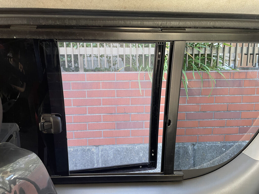 真夏の夜に、まったく締め切った状態でいるよりは、窓枠に網戸が入っているだけでも、若干はマシになります。ただし、横のスライドドアだけが開いている格好ですので、もっと涼を求めるなら、運転席や助手席の窓、後ろのハッチバックドアにも網戸をしつらえる必要があるな、と感じました。
