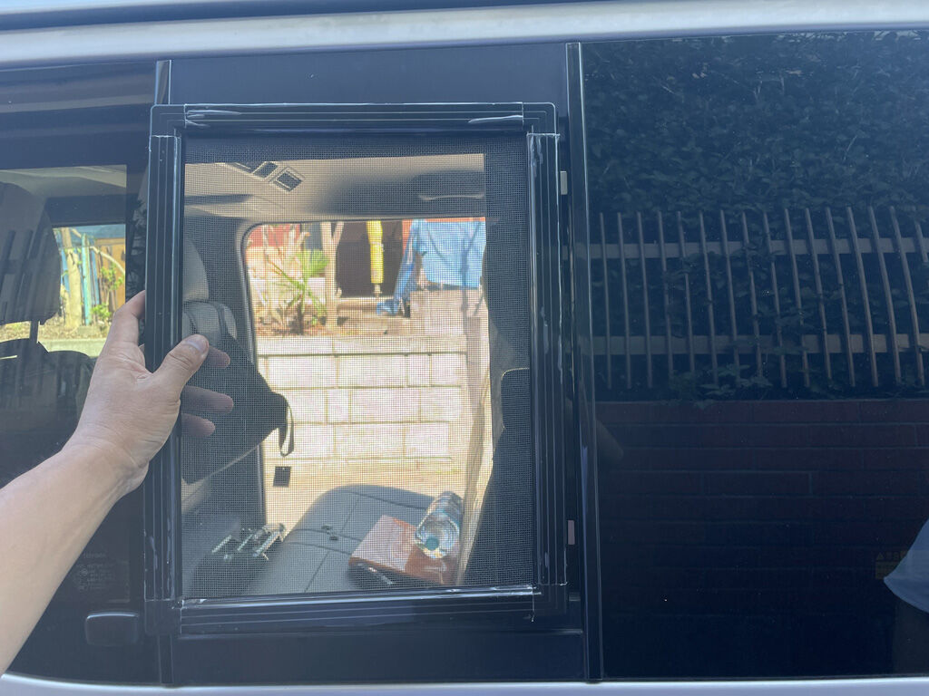 となれば、スライドドアやハッチバックを全開にした状態で使うのが前提の防虫ネットでなく、スライドドアの窓につける網戸で十分ではないか、という結論になりました。