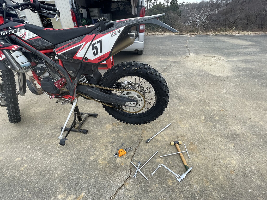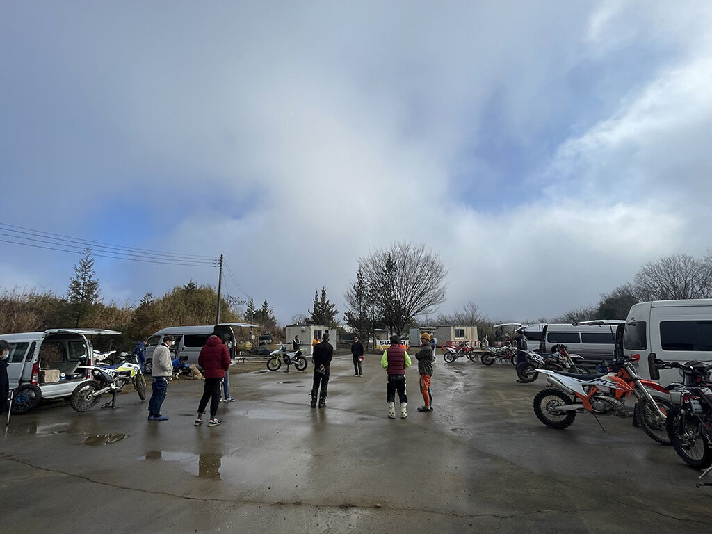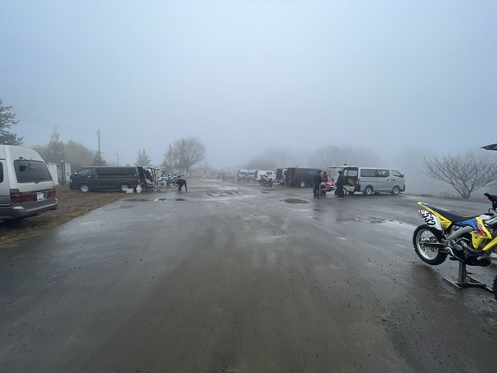 明けて翌日。朝方は真っ白い霧が出て前も見えにくいといった状況ですが、これはここ最近、市貝にはよく見られる傾向で、前の日に雨が降って翌日気温が上がる日には霧が出ます。そして0900時頃には晴れます。案の定、よく晴れて日差しが眩しいくらいでした。試走に行ったマーシャルさんのバイクの泥のつき具合を見て、タイヤの空気圧を前0.5後0.4に変更。前回に比べれば0.1ずつ高めですが、結論からいうと、もう0.1ずつあげた方が良かったです。この点は、まだまだBTC市貝の事がわかってないなという感じ。