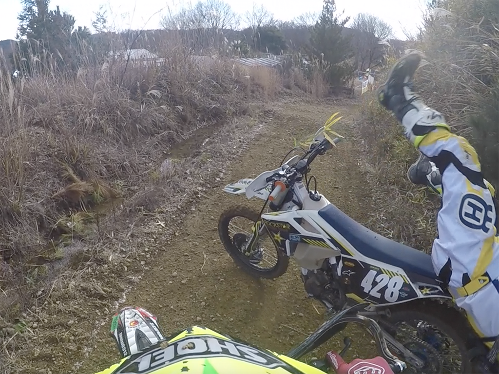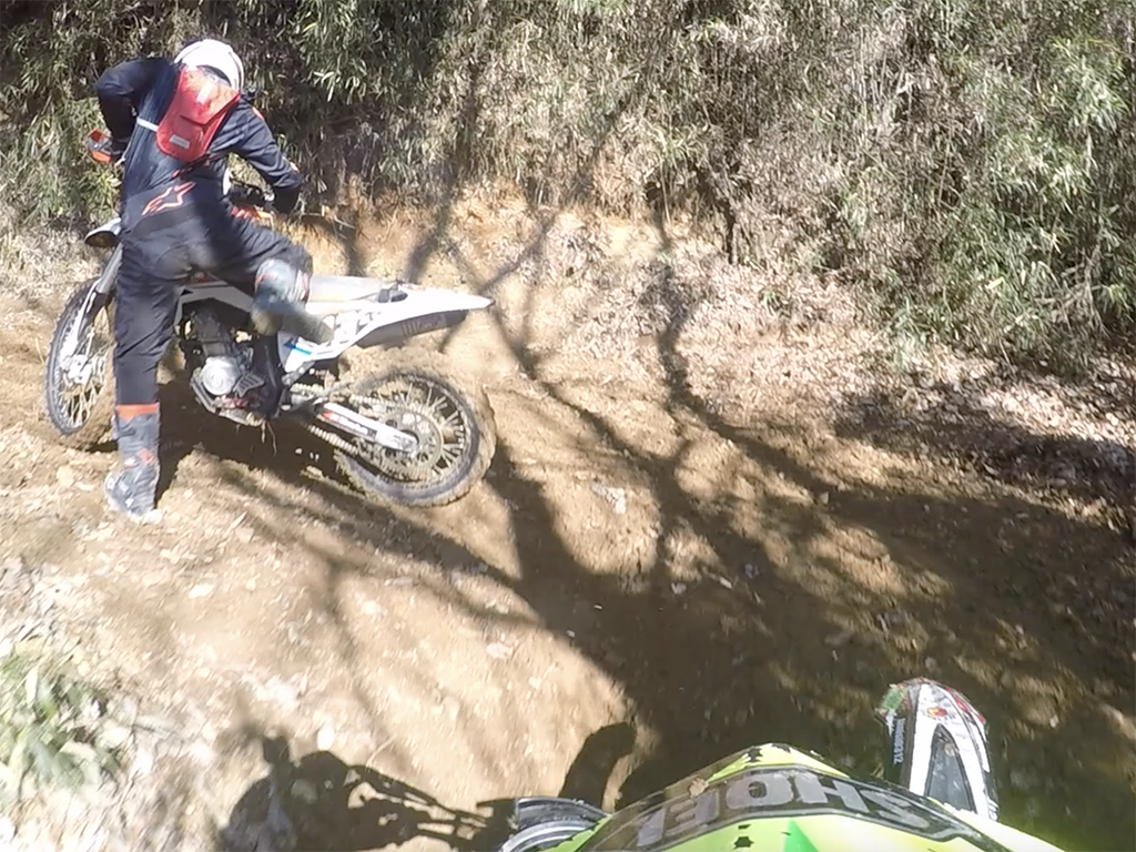 そうこうしているうちに、前を走ってたふーちゃんが、新井坂でスタックしました。ここはイン側の轍にフロントから入っていくと、切れ込みすぎてそうなってしまう事は、先週の練習で確認済みです。バイク降りて必死で押し上がろうとするふーちゃんを大外から回り込んで抜き去りました。直ちに最大戦速で逃げに移ります。