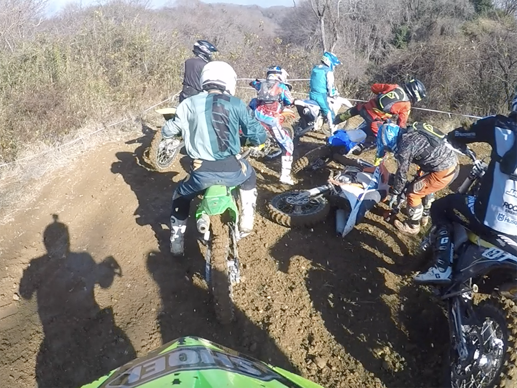 そしていよいよスタート。相変わらず上級生の人らの小石を食らいながら必死でついて行ったのですが、1コーナーでコケた人を避けようとしたら、結局最下位に。それでも始まったばかりですし、ケツから3人目まではBクラスのO貫君、ふーちゃん、自分の順なので、とりあえずビッタリ後を追尾して、チャンスを伺いいました。