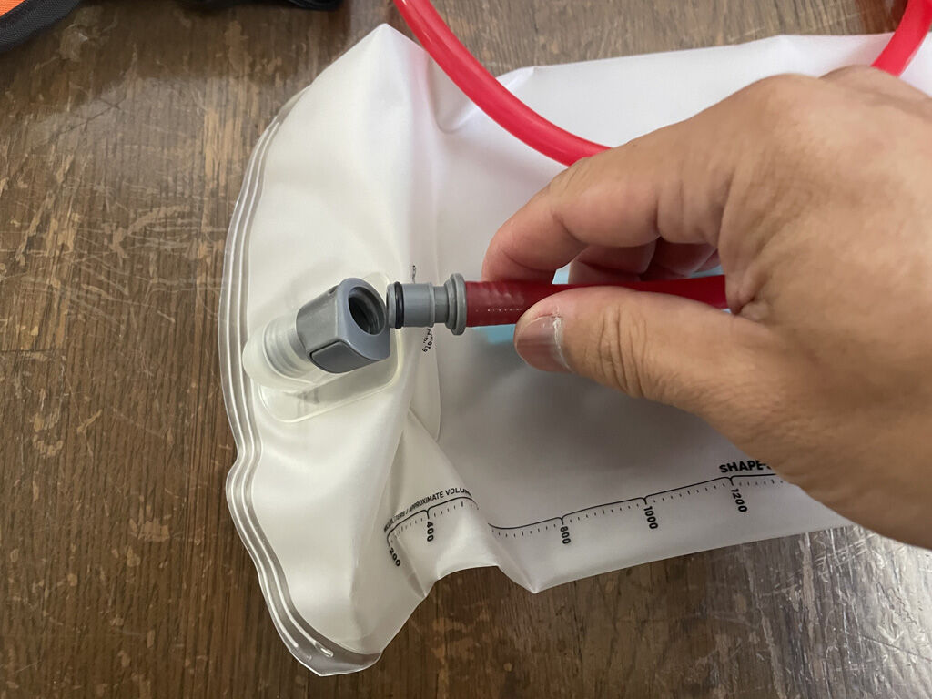 USWEのハイドレーションパックへ給水するには、カバーからハイドレーションパックを取り出し、パックの上辺のスライドストッパーを外してパックの口を広げて給水を行います。キャメバックの時は、カバーを開けて蓋を開けてそのまま給水できましたが、この点はちょっと面倒です。