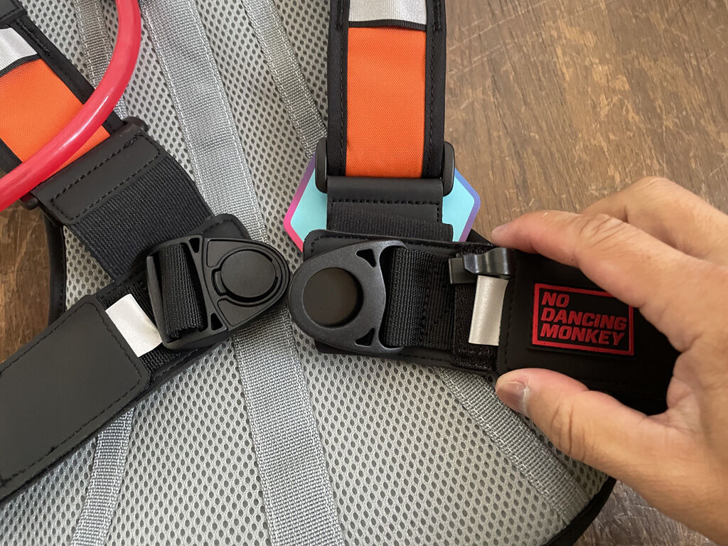 ハーネスは左右上下ともにベルクロで調整が可能ですが、自分の場合、もともとデブっててボディがデカい上に、さらにその上にチェストプロテクターを着けますので、結構幅を取ります。上のハーネスは若干伸ばした程度でしたが、下のハーネスは全開にしないとバックルが届かず、それでもハーネスのゴムバンドの部分が伸びてる様な感じでした。もっとも、そのお陰でぴったりフィットしてます。