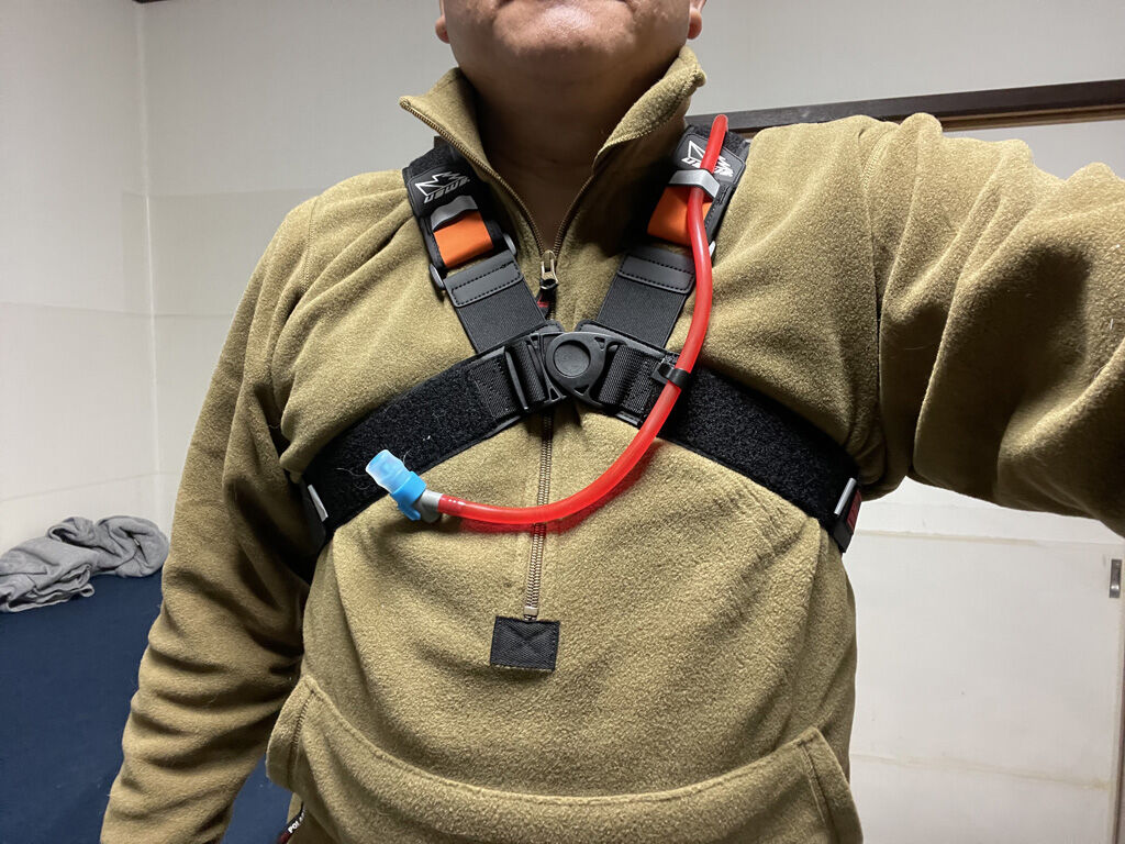 チューブはハーネスの左右どちらからも出せる様になっていますが、下に垂れ下がったチューブを留めるフックは左側の下のハーネスに固定されています。察するに、スロットル操作は右手でやっているので、右手は使わず左手を使えという事だと思うのですが、これまでずっと右手でやってきたので、ちょっと練習が要るかもしれません。