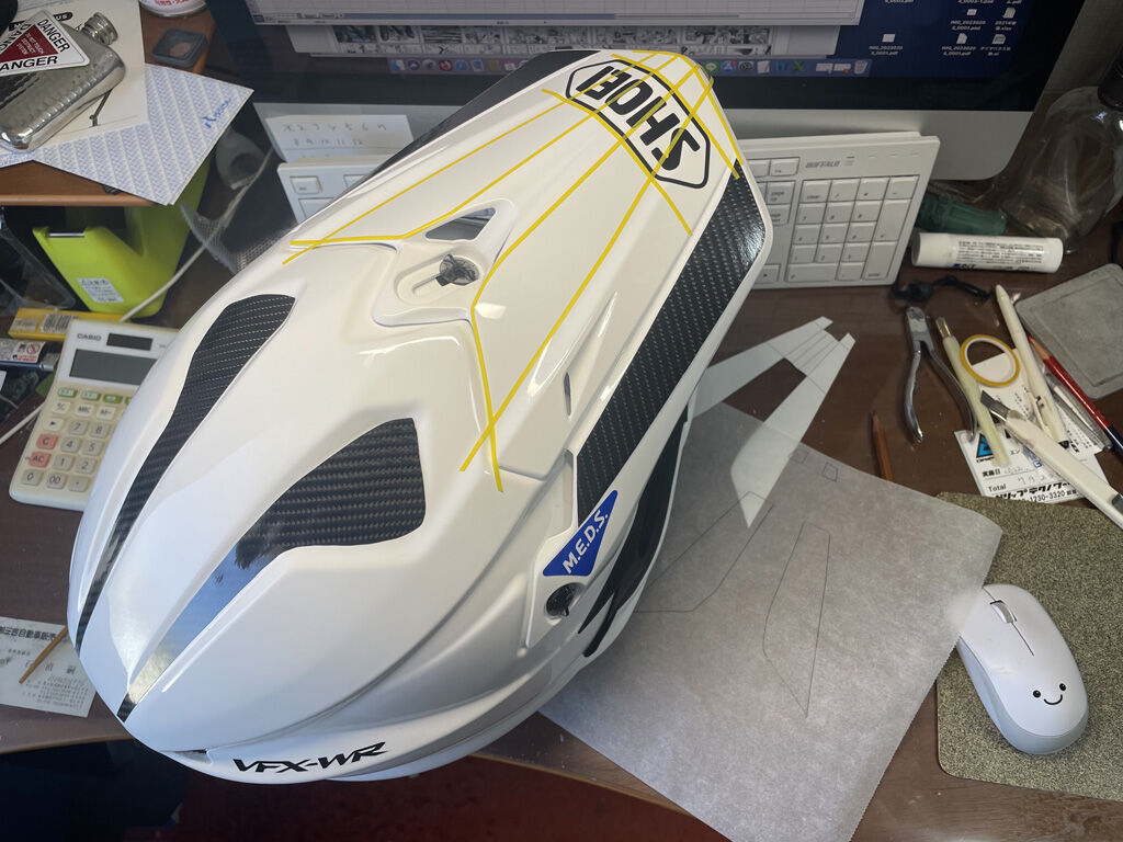 とはいえ、全くの真っ白けでは少々寂しいので、伝統のデンジャーステッカーと安全運転ステッカーを背面に貼りました。また、ワンポイントでわざわざシルバーのノーズカバーを取り寄せ、バイザーのネジもバイザーのスクリューも前の奴から取ってスモークのに代えました。