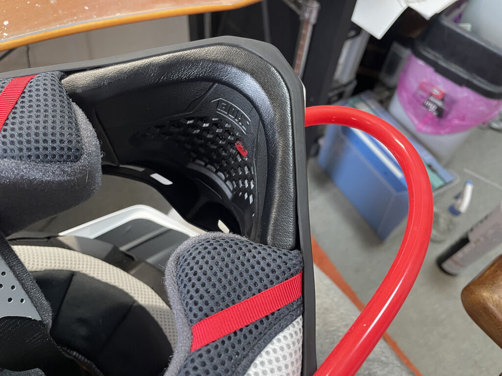 これが済んだら、チューブの先にバルブバイトを付け、ノーズカバーをヘルメットに取り付け、チューブの後端についてるベルクロ部分をヘルメット本体にセットします。本来は、ヘルメットの帽体や内装にベルクロテープを貼り付けて使う様ですが、WFX-WRはテープ貼る部分が適当でなかったり、内装もテープが効かなさそうな感じだったので、ベルクロテープを内装の隙間に押し込む格好にしました。まぁ少々の事では取れないっぽいです。