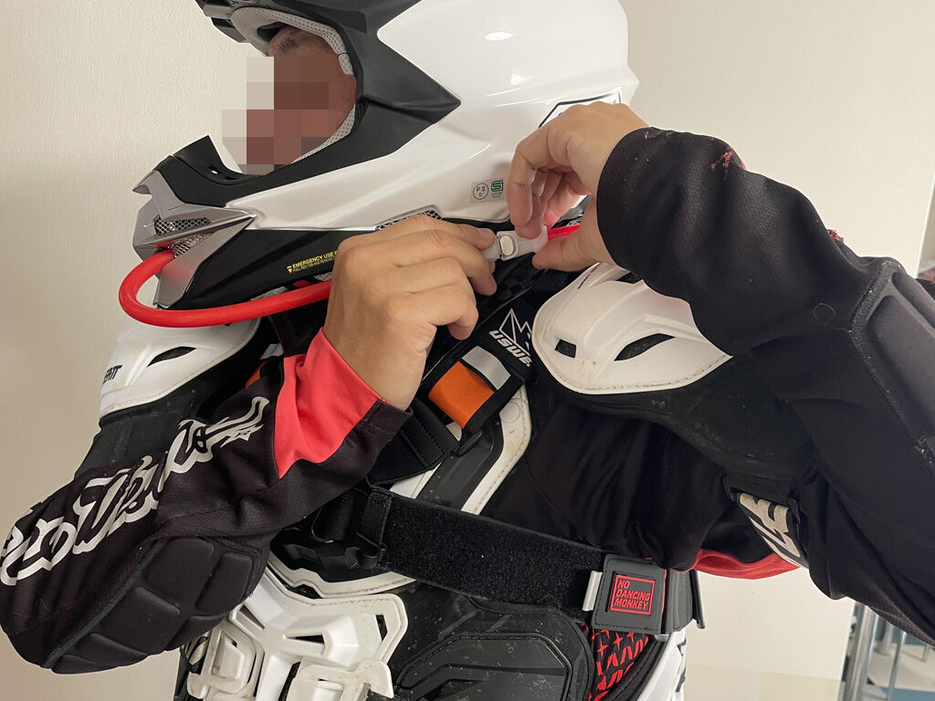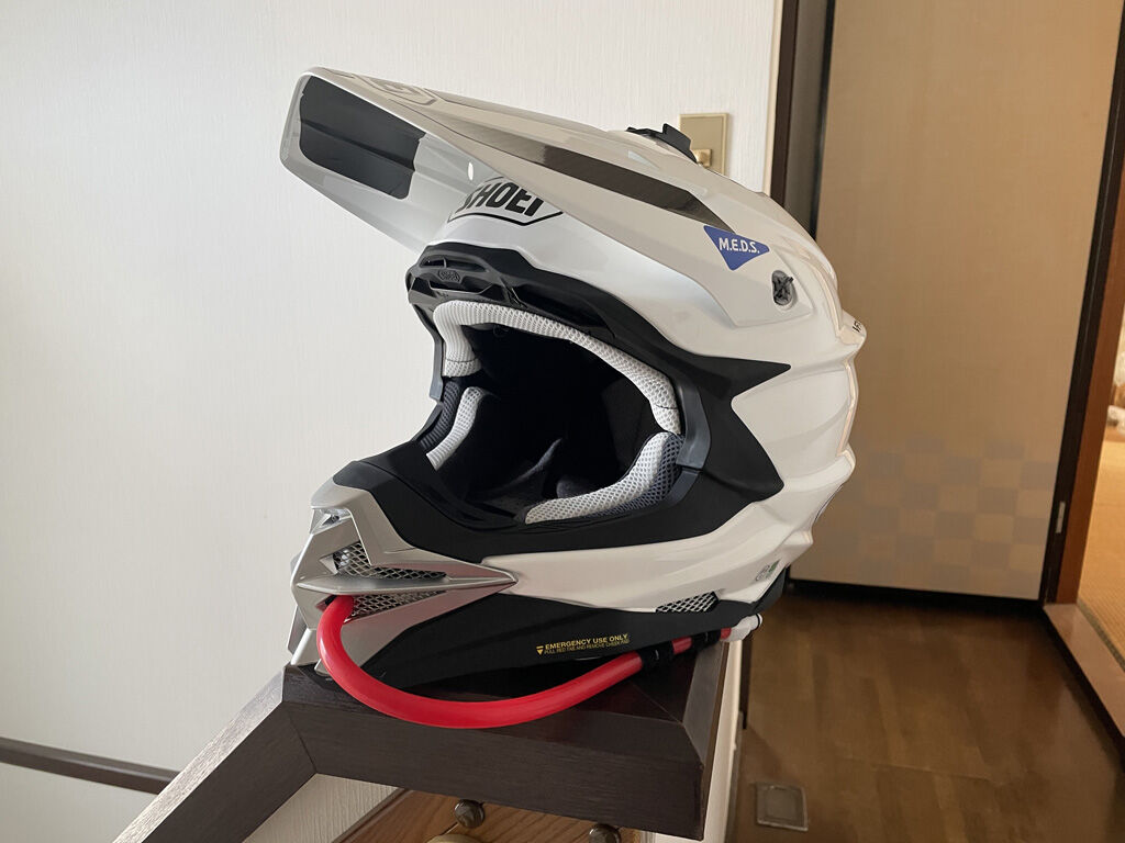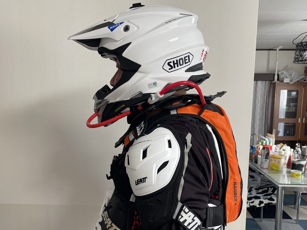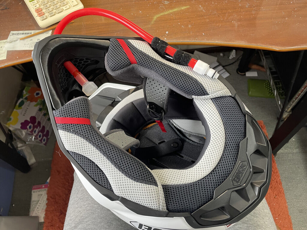 一応は絶妙な位置でカットしたつもりなのですが、それでもヘルメットの後端から背中にかけてチューブが伸びてる感じで、なんか引っかかったり、コケた時に千切れたりしそうな雰囲気ですが、まぁ、今んとこはこれ以上のことは出来ないので、しばらく様子を見ようと思います。
