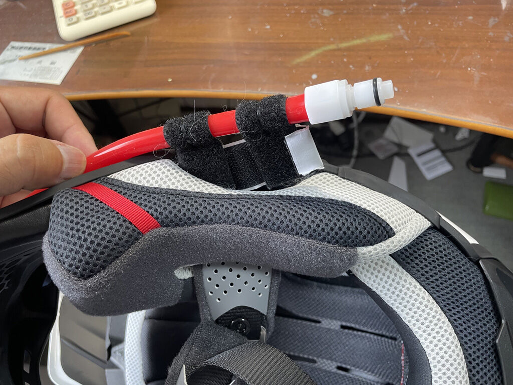 言い換えるなら、ヘルメットに取り付けるバルブ側のチューブは、常時ヘルメットに装着した格好でなく、使う時に取り付けるといった使い方になると思います。まぁ、それもあって、バルブ側のチューブを固定するベルクロテープは、敢えて内装に貼り付けず押し込む格好にしたのですが、まぁ、今後の状況次第では、やっぱり貼り付ける方が良いのか、他の方法を考えるかもしれません。