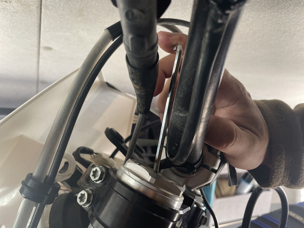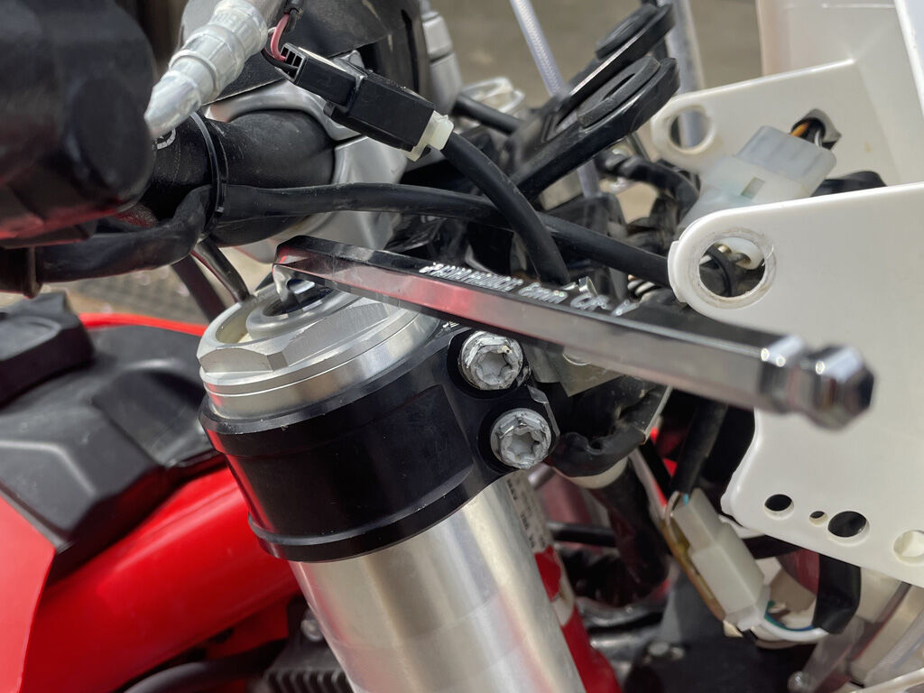 まぁ、L型の六角レンチに使い勝手もヘッタクレもない様なもんですが、まぁ、普通に使い勝手は良いです。さっそくクロトレのフロントフォークのアジャスタースクリューに使ってみましたが、左の油圧ダンパーの方は4mm、右のスプリングプリロードの方は8mmをそれぞれ使いますが、ショートヘッドなお陰でハンドル付けたままでもレンチを差し込めますし、ロングタイプなので操作もしやすいです。