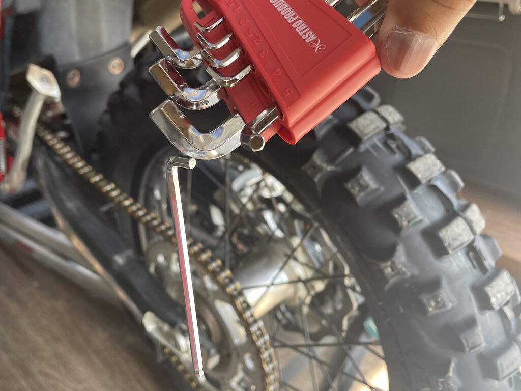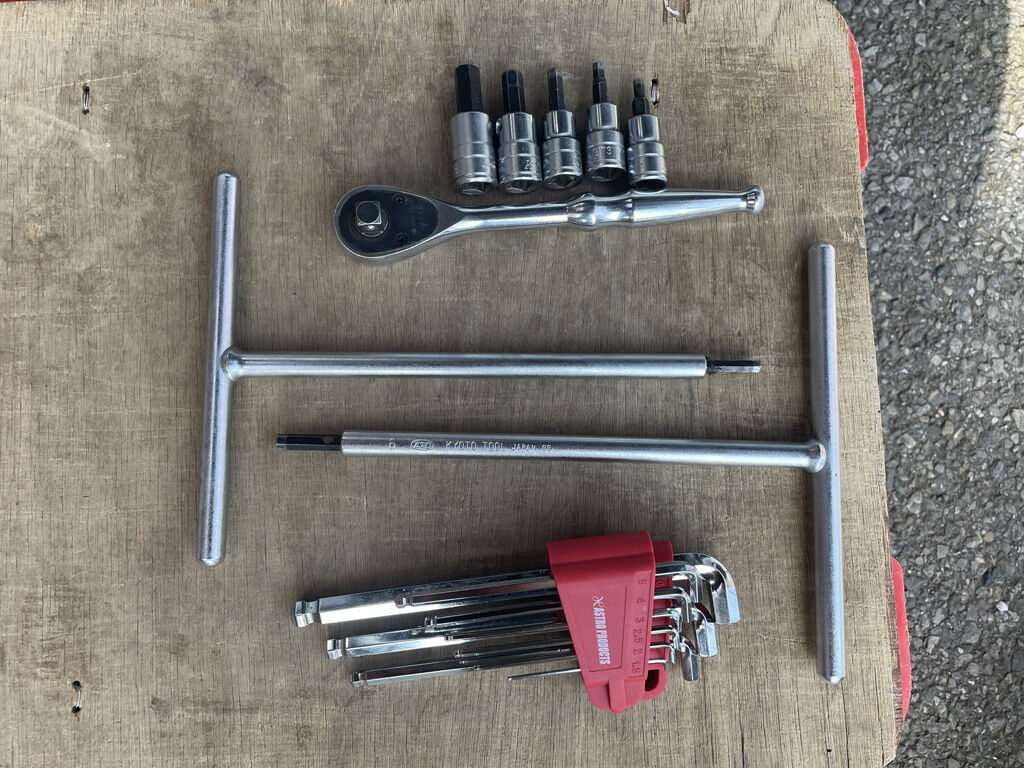 これまで自分が使って来たヘキサゴンレンチは、ソケットかTレンチのタイプで、いわゆるL形の物は若干は持っていますが、実際にはほとんど使った事がありません。せいぜい、ボタンボルトのヘキサゴンレンチ差し込む穴に詰まった泥を、細いL形レンチでほじって掃除する程度でした。ぶっちゃけた話し、バイクの整備でL形の六角レンチを使うなんてのは、まずなかったのです。その様な訳で、これまで持ってた六角レンチは、クロトレのフロントフォークの調整には全然役に立ちません。