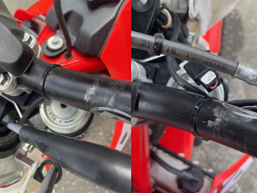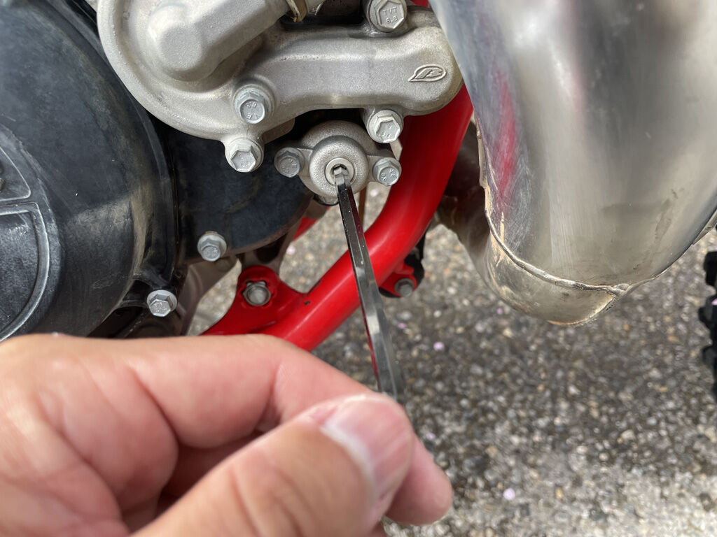 それなりに上等なオフロードバイクの場合、フロントフォークはフォークの上側に圧側の調整、下側に伸側の調整のネジなりダイアルが付いている事が多いのですが(ついでに言うとエア抜きのネジも上に付いてたりする)、クロトレの場合は、左側のフォークが油圧式のリバウンドダンバーでダンパー調整、右側のフォークがスプリングでスプリングプリロード調整、という造りになっていて、調整はフォークの上側についている六角レンチで回すネジで行う様になっています。