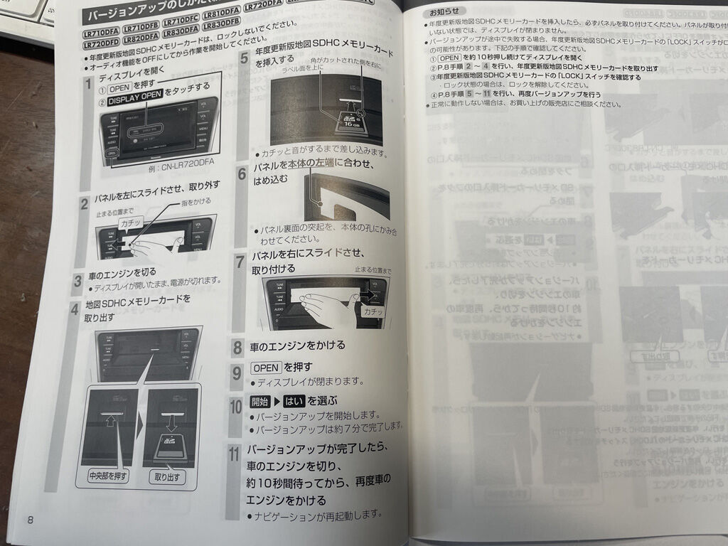 さて、いよいよ更新作業です。作業の手順は取扱説明書に書いてあるので、その通りに行います。見るからに簡単そうです。手順通りにSDカードを挿して、エンジンかけて、カーナビのモニターを起こして、、、あれ?「開始」も「はい」も出てこないぞ? 同じ手順を2回繰り返しましたが、やはり起動した時はいつものカーナビの起動画面で、更新画面が出て来ません。