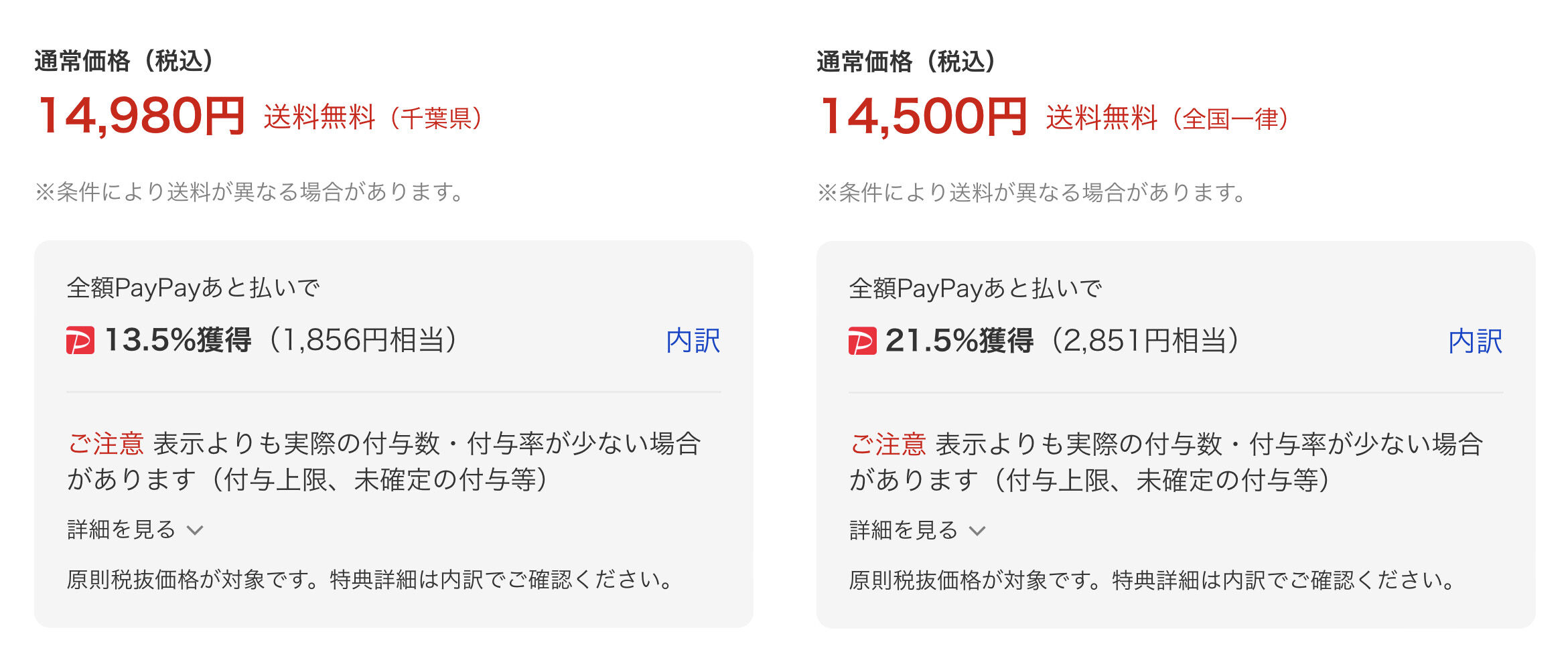 そこでネットショップを調べてみると、いつも自分が使っているヤフーショッピングだと、14,980円で結構安い。5のつく日で買えば11.5%もポイントがつく。物が同じなら安いに越した事ないのです。そうこうしてるウチに、超PayPay祭が始まってポイント付与が12.5%になったんで、即座にポチりました。