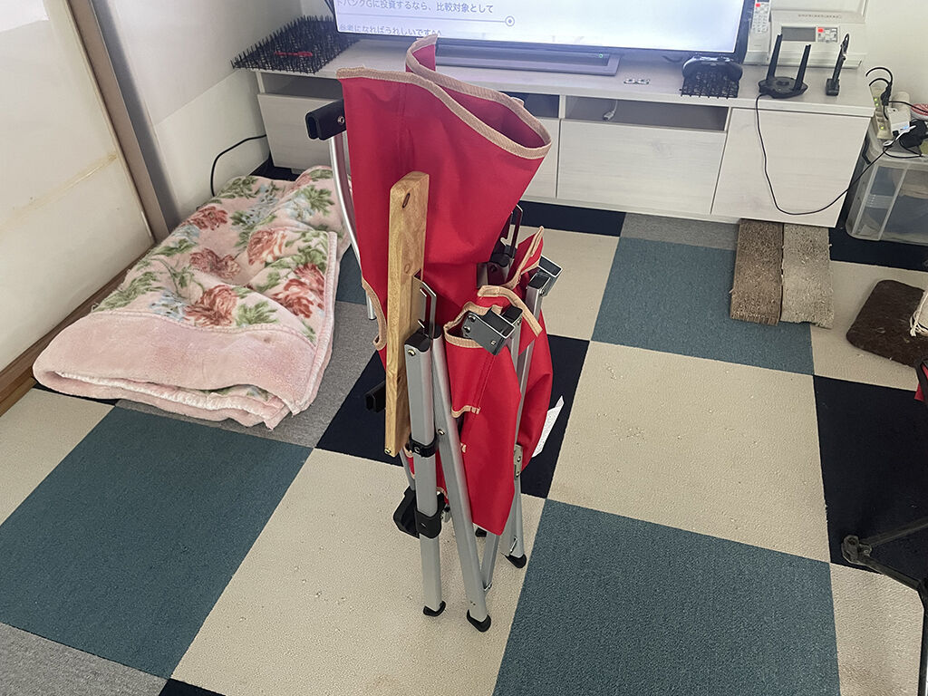 そんな折り見つけたのが、今回調達したレイチェア。大きな特徴は、リクライニングは言うまでもなく出来るのですが、重さが3.7kgとこれまで使ってきたアームチェアと500gしか重くない事、収納サイズが約25×15×89(h)cmとアームチェアの約14×14×87(h)cmと大差ない事です。耐荷重は約80kgですが、アームチェアも同じなので、よほどドシンと座らなけれな壊れる事はないでしょう。お値段は定価だと11,880円だそうですが、ネットショップだと大体9,000円くらいの様です。
