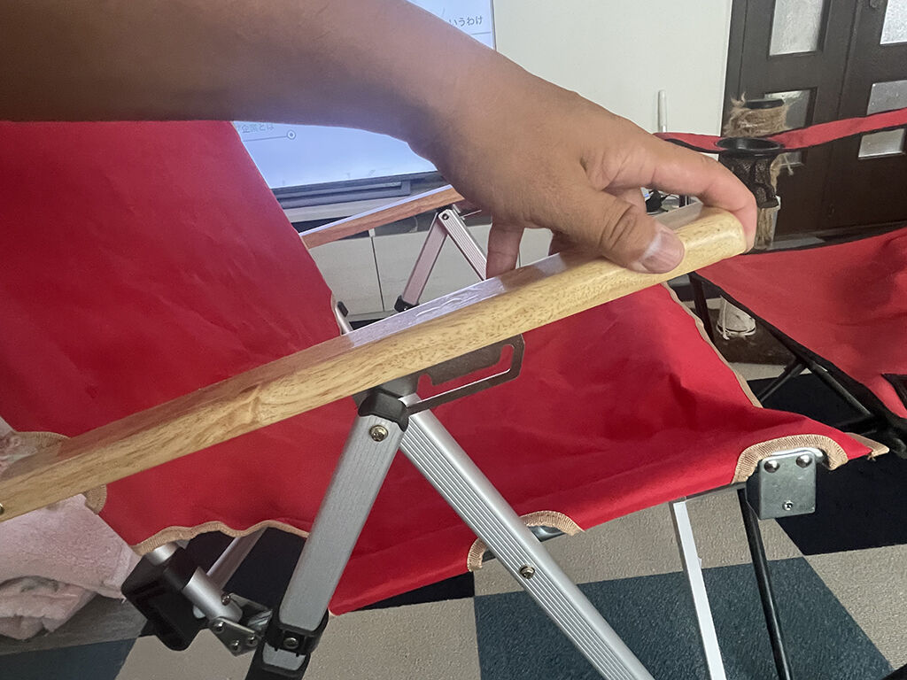 使い方は至って簡単で、袋から出して、広げて、背もたれの後ろにあるフレームを下に下げて、座面を完全に広げたら完了です。リクライニングのさせ方は、肘掛けを少し持ち上げて後ろにスライドさせれば、背もたれが倒れます。起こしたい時は、前にスライドさせれば起きてきます。背もたれは3段階で調整できますが、自分の場合は、起きてるか寝てるかだと思います。