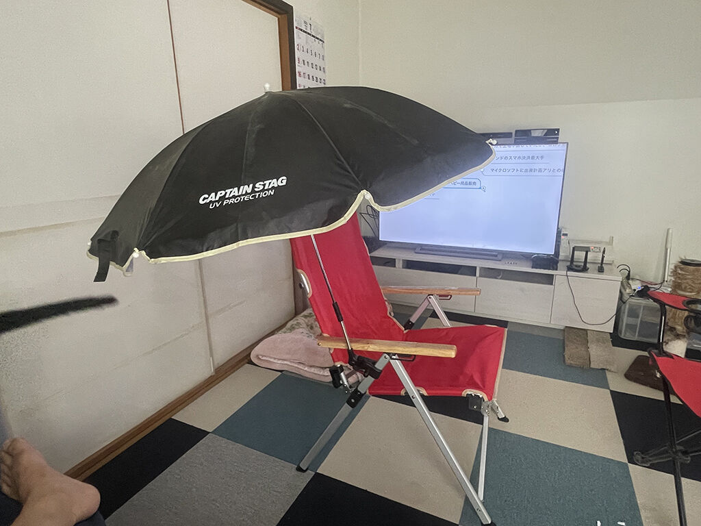結構良いとこづくめなのですが、一つだけ問題がありました。というのは、これまでのアームチェアには、日よけにキャプテンスタッグのパラソルを付けていたのですが、これをどこに付けようかという事。今までは背もたれのフレームに付けてましたが、レイチェアはリクライニングするので付ける事が出来ないのです。