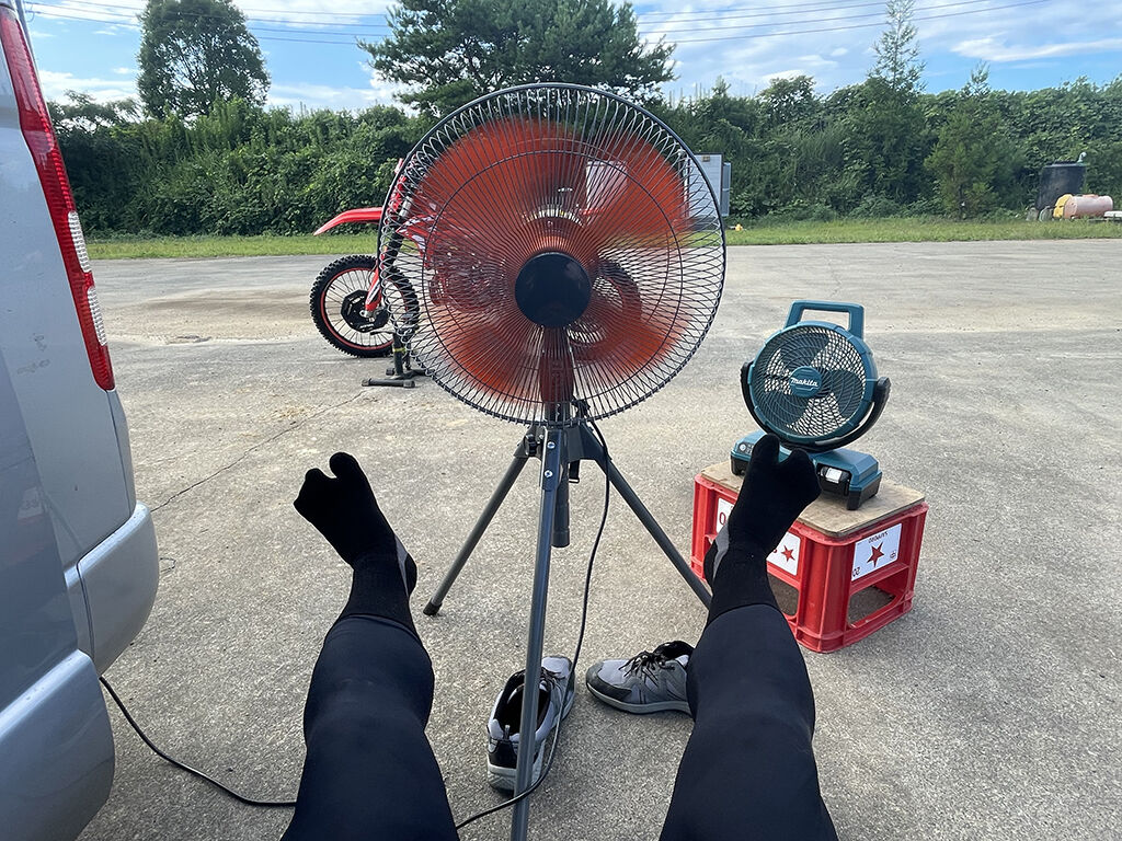 ポタ電の充電中は、マキタの扇風機でしのぎますが