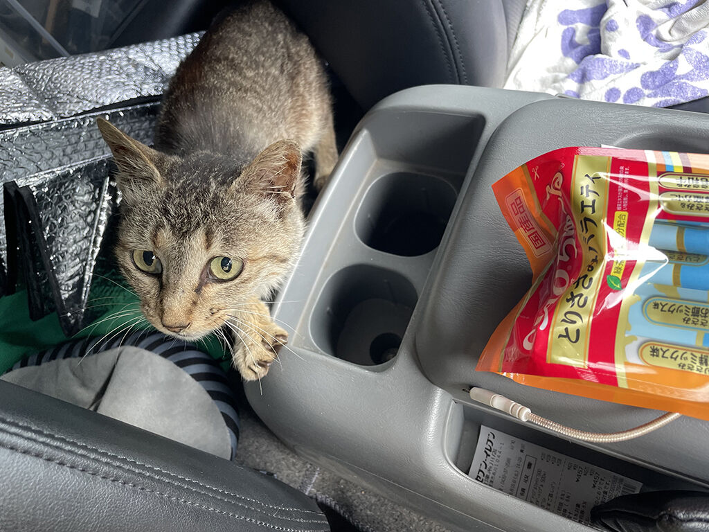 この時点で連れて帰る気満々で、嫁はんに電話してケージやらペットシートやらを準備させ、連れて帰るなら今日は練習どころでないので、直ちにバイクやら装備やらを積み込まねばならないのだが、子猫が逃げない様にする猫バッグもないし、どうしようかと思ってたら、セカンドシートにウンコされてました。まぁ、知らん車に載せられて怖かったのでしょう。まずはウンコの処理をせねばなりません。