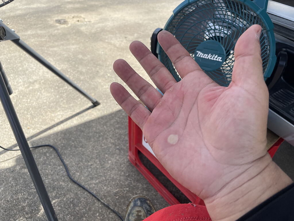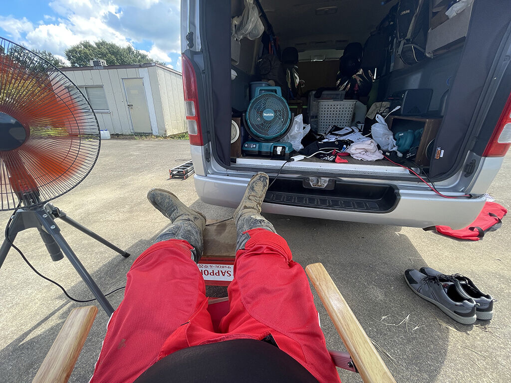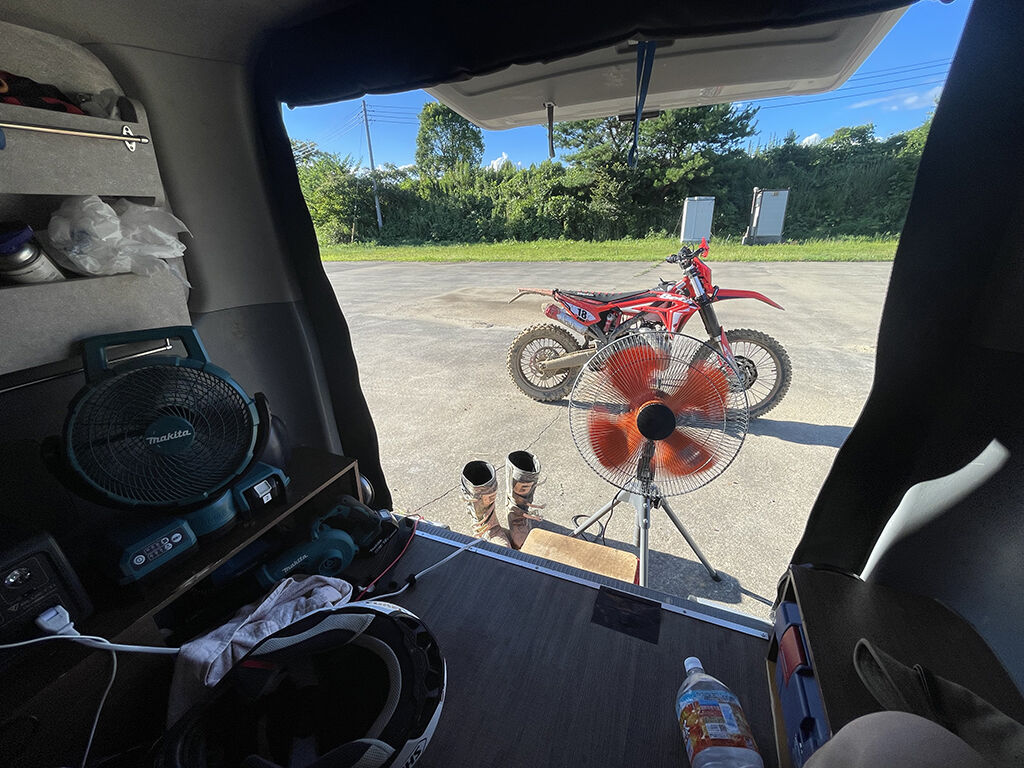 いつもの様に早起きして(前の晩は0000時就寝、0400時起床)、BTC市貝には0800時頃到着。早速バイクを下ろし、工場扇やらポタ電やらソーラーパネルを準備して、暑さに備えました。天気は晴天。ちょっと雲が多い感じでしたが、晴れればソーラーパネルは元気に発電してました。