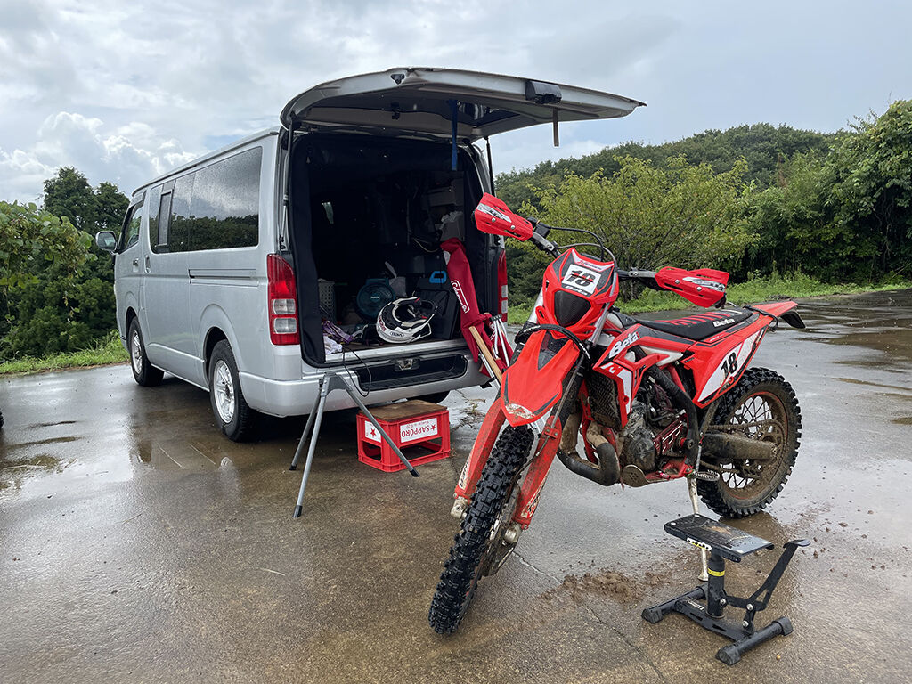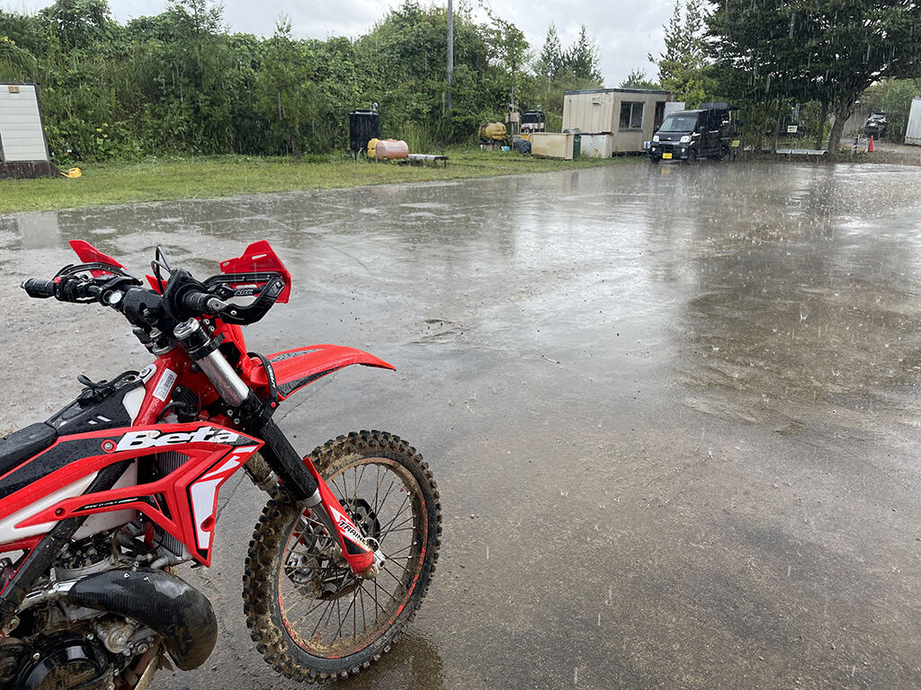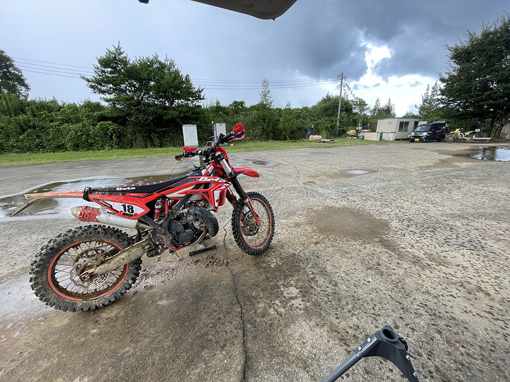 雨が小降りになるまで待ってましたが、完全にコースはマディになるほど降りました。まぁ、マディといっても、そこまでグチャグチャになる様なコースではないのですが、それでも滑る所は滑るでしょう。どうせならお金払う前に降ってくれよー、と思わないでもなかったですが、払ったもんはしゃーないし、雨降ったからってレースはありますから、覚悟決めて走る事にしました。