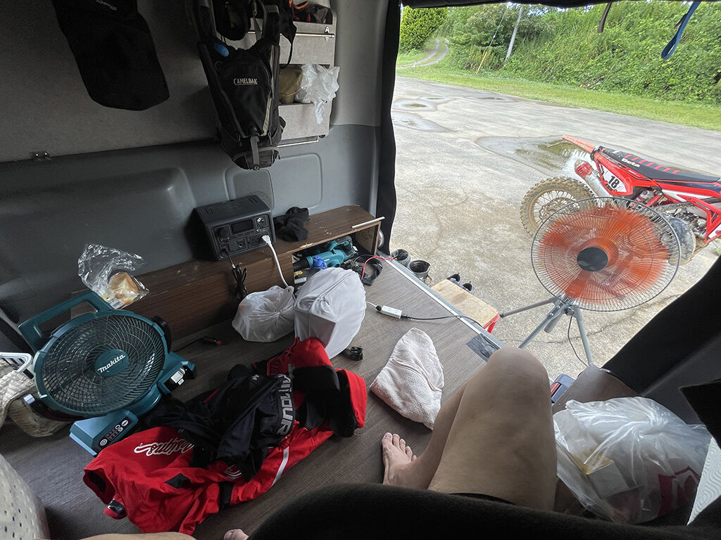 これらアドバイスを頭に入れた上で、さて着替えよかと思っていたら、ザラザラと雨が降り出しました。しかもすぐに上がりそうもない。トランポの上のソーラーパネルを直ちに取り込んで(片足だけに―ブレース着けた格好だった)、工場扇もハッチバックの下に退避させて、レイチェアは思い出した時にはずぶ濡れでした。