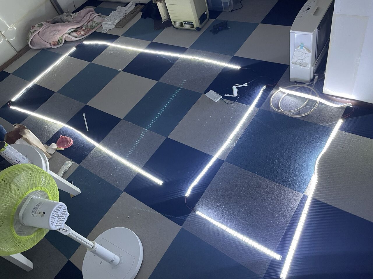 サイズは縦210cm、横95cm。間の電線は15cmで継いで、2本のテープライトは自作の分岐ケーブルで並列に繋げる事にしました。気になったは、延べ5メートル近い長さなので、電源から遠い末端の部分では明るさが半減するのではないか(5Vのテープライトで半減した)という事でしたが、この製品は明るさに差がありませんでした。