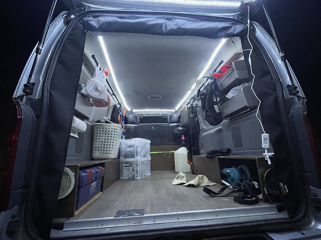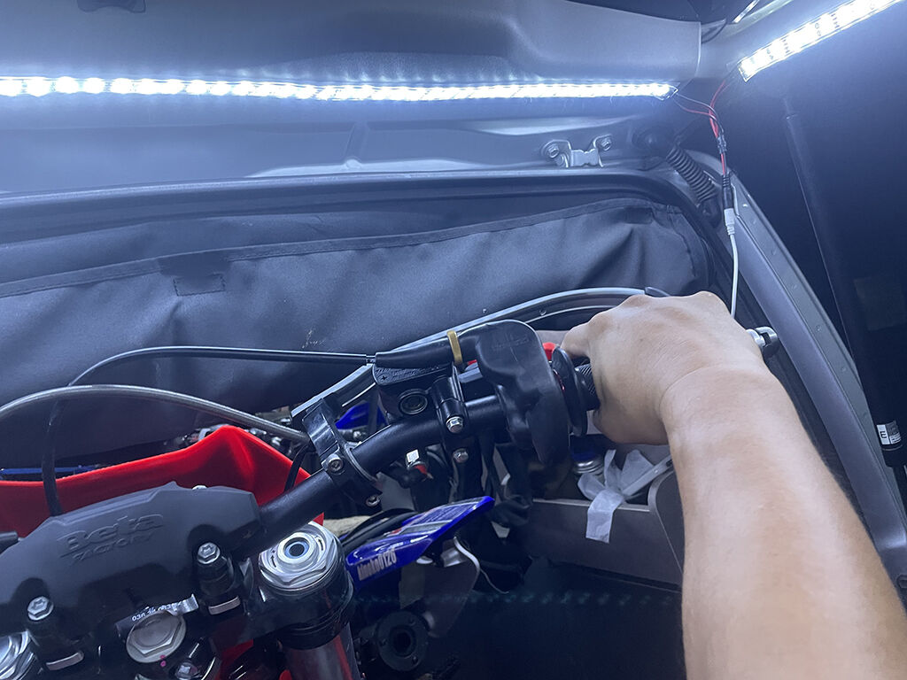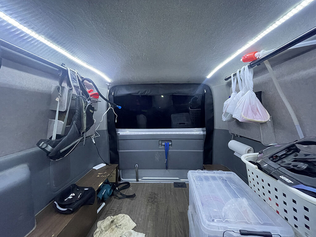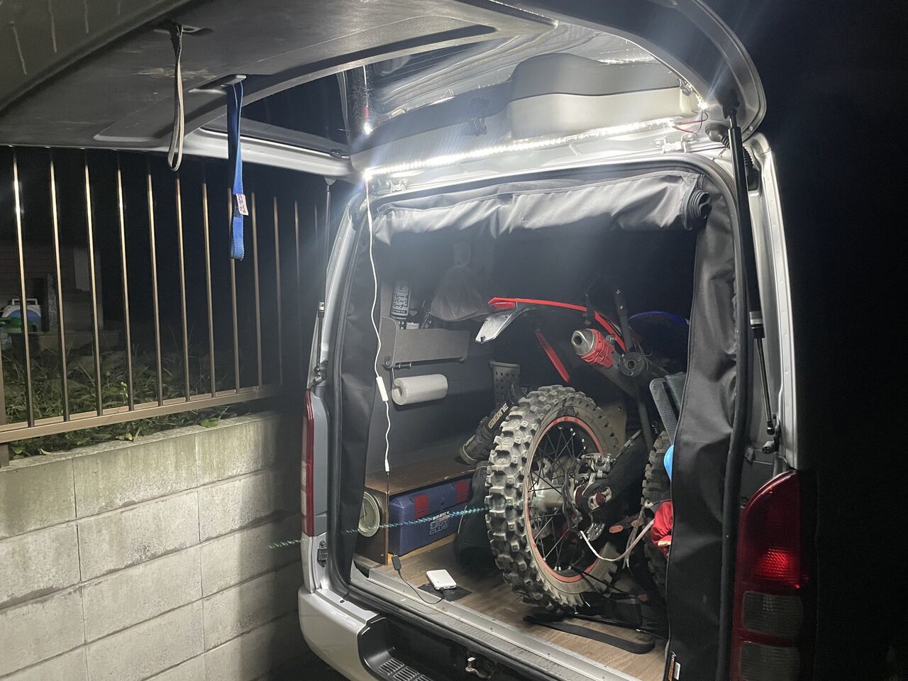 続いて装備とバイクを下ろして、荷室の天井の方にテープライトを貼り付けます。最初は食いつきが悪いのですが、とにかく一旦ババっと貼り付けてから、少しずつ位置や真っ直ぐにする微調整を行いました。これも一旦食いつくと、それなりにしっかり付いてくれます。そして点灯。これまた家並みの明るさで、大満足でした。