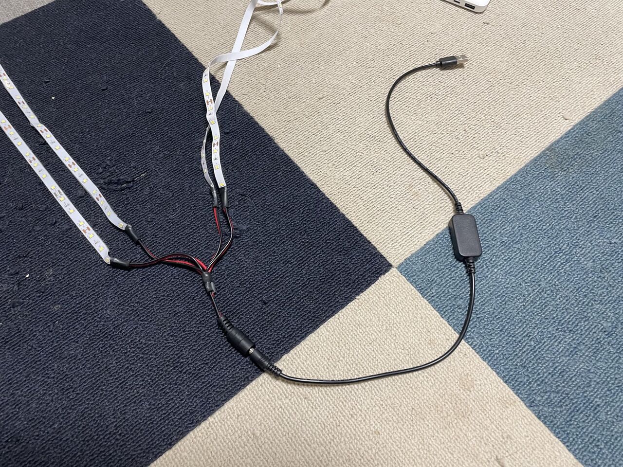 さて、テープライトを二分割の上、二重にすると決めた時、電源のケーブルは1本に集約する事を考えていました。つまり、4本のケーブルを1本にまとめる訳です。そうした分岐ケーブルも売っているのですが、あまりゴチャゴチャとケーブルが付いていると、その重みでテープライトが垂れ下がってくるのが分かったので、出来るだけ軽くしたかった訳です。