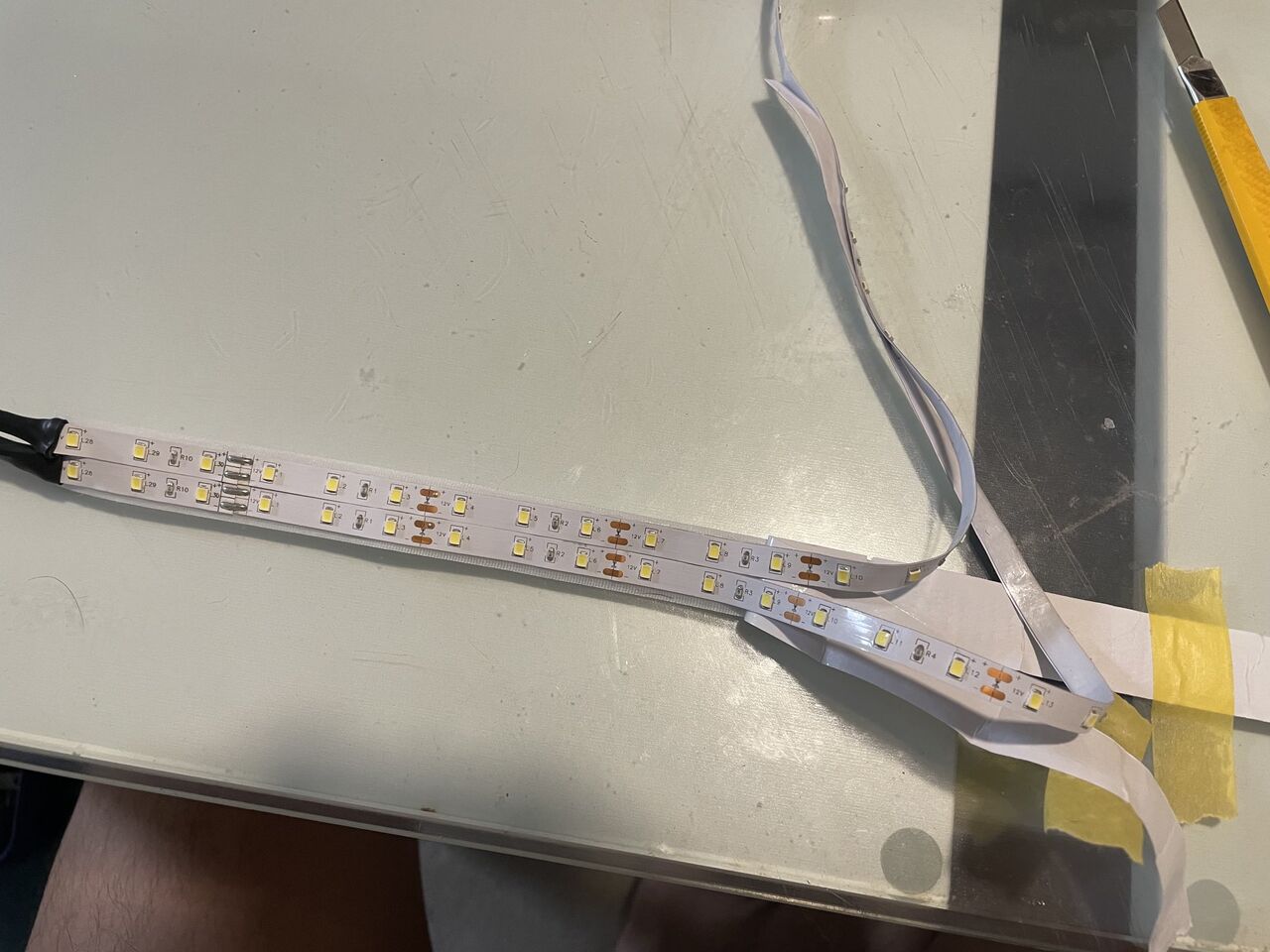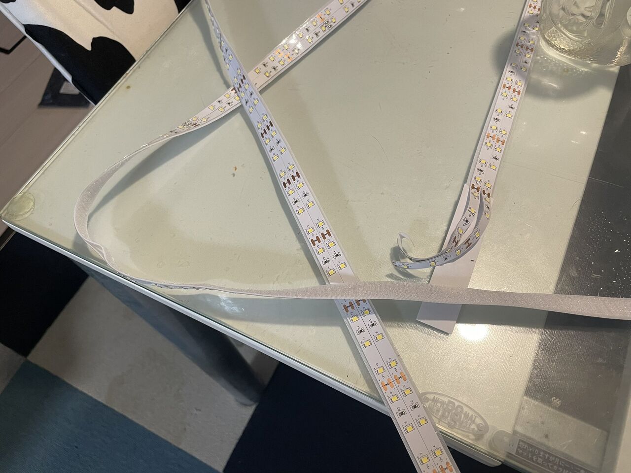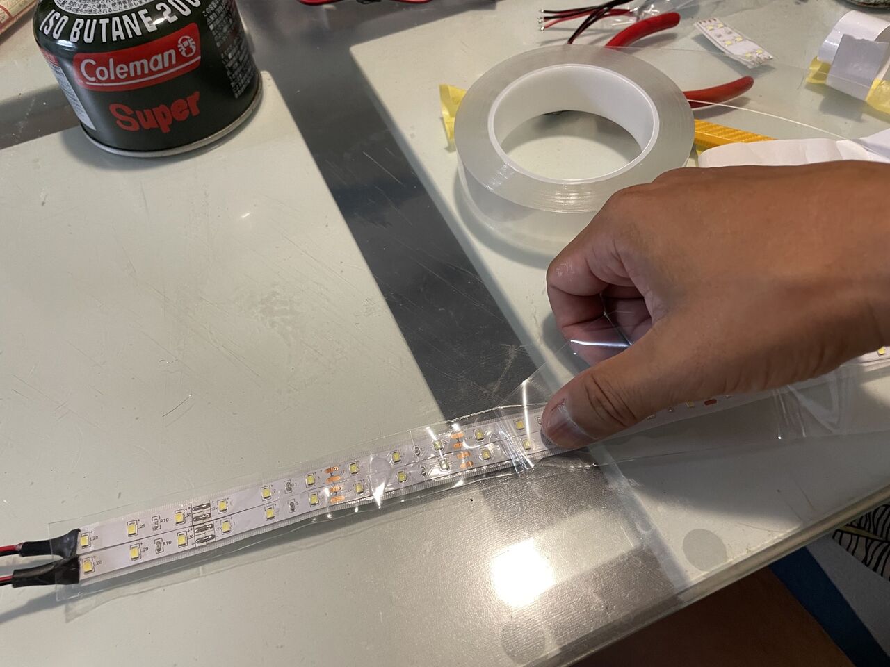 これが済んだら、テープライトをベルクロテープに貼っていきます。ベルクロテープは20mm幅のもので、これにテープライトを2本貼っていきます。慌てると曲がったり斜めったりするので、少しずつ裏紙を剥がして、丁寧に貼っていきます。