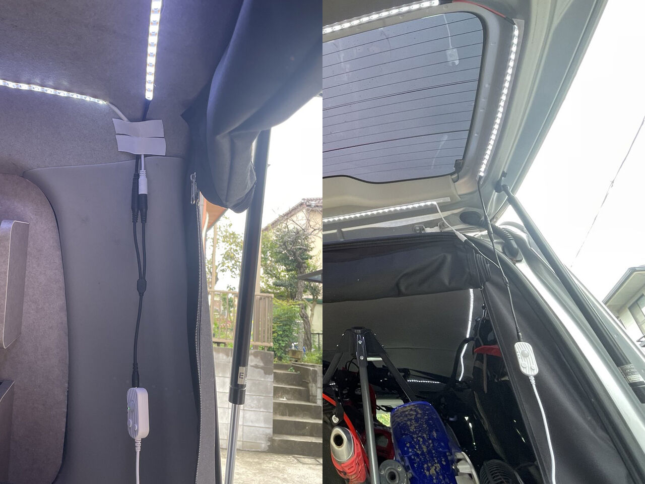 結局、12Vのテープライトを使う事にしたのですが、それでも1本よりは2本使った方が明るくなる道理で、暗闇の中でバイクを上げ下ろしする時に使うなら、特にハッチバックの方は明るいに越した事がない、と考えたのです。