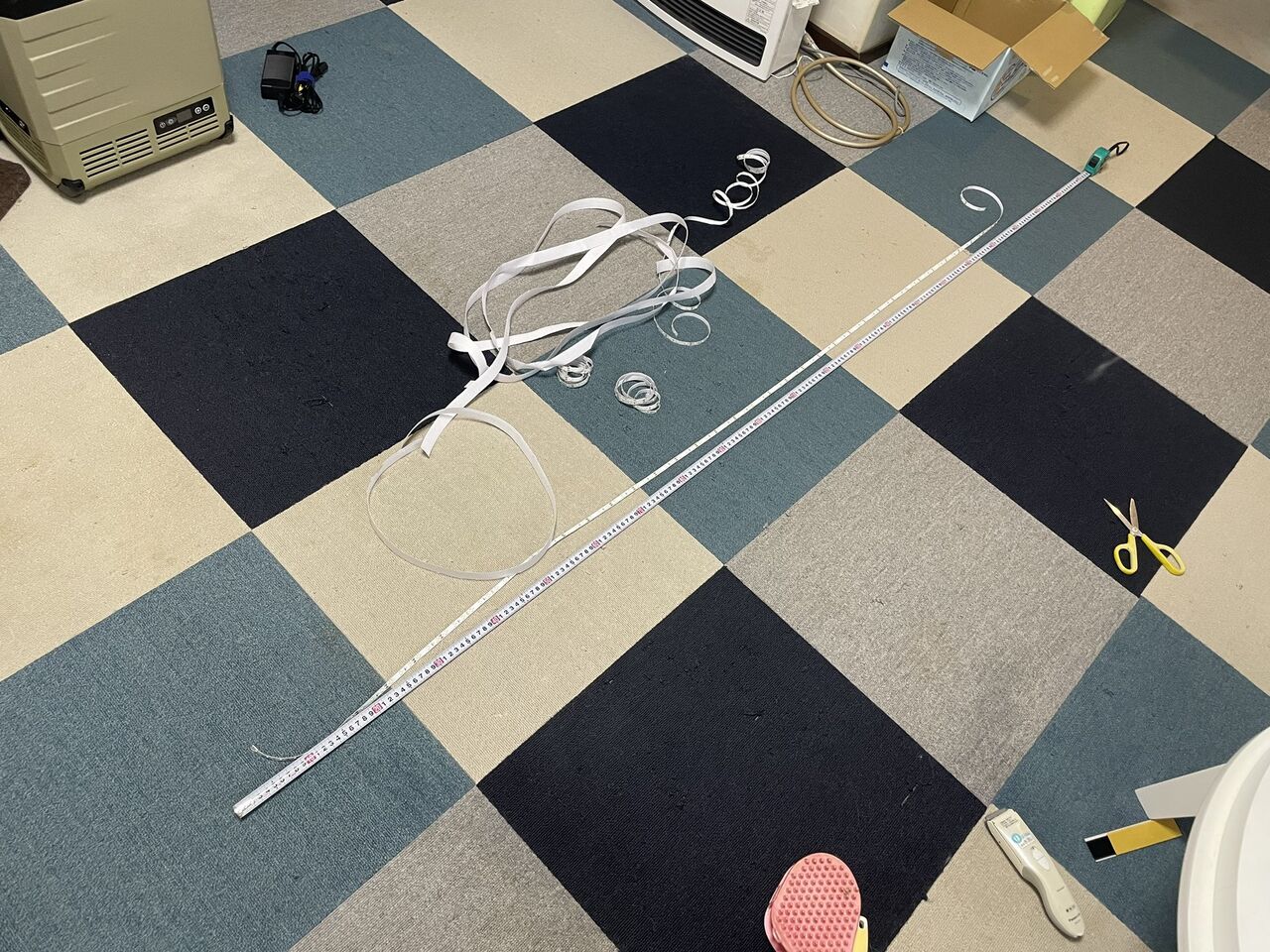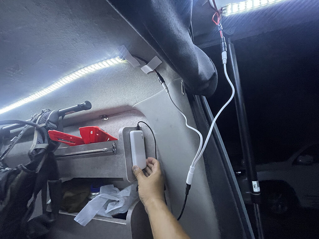 このテープライトは、基本的にはモバイルバッテリーで稼働させ、長時間使う時はポータブル電源を使う予定なのですが、現時点ではケーブルやスイッチをどうするか、まだ決めてませんでした。実際にテープライトを付けてみない事には、具合も不具合も見えてこなかったからです。