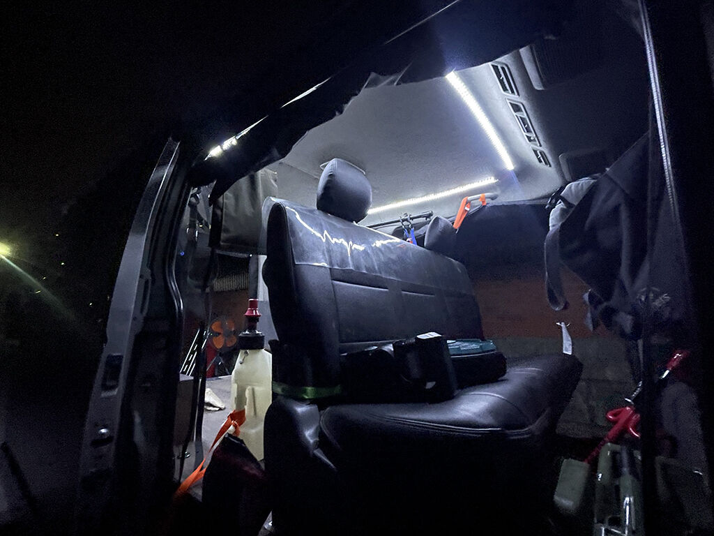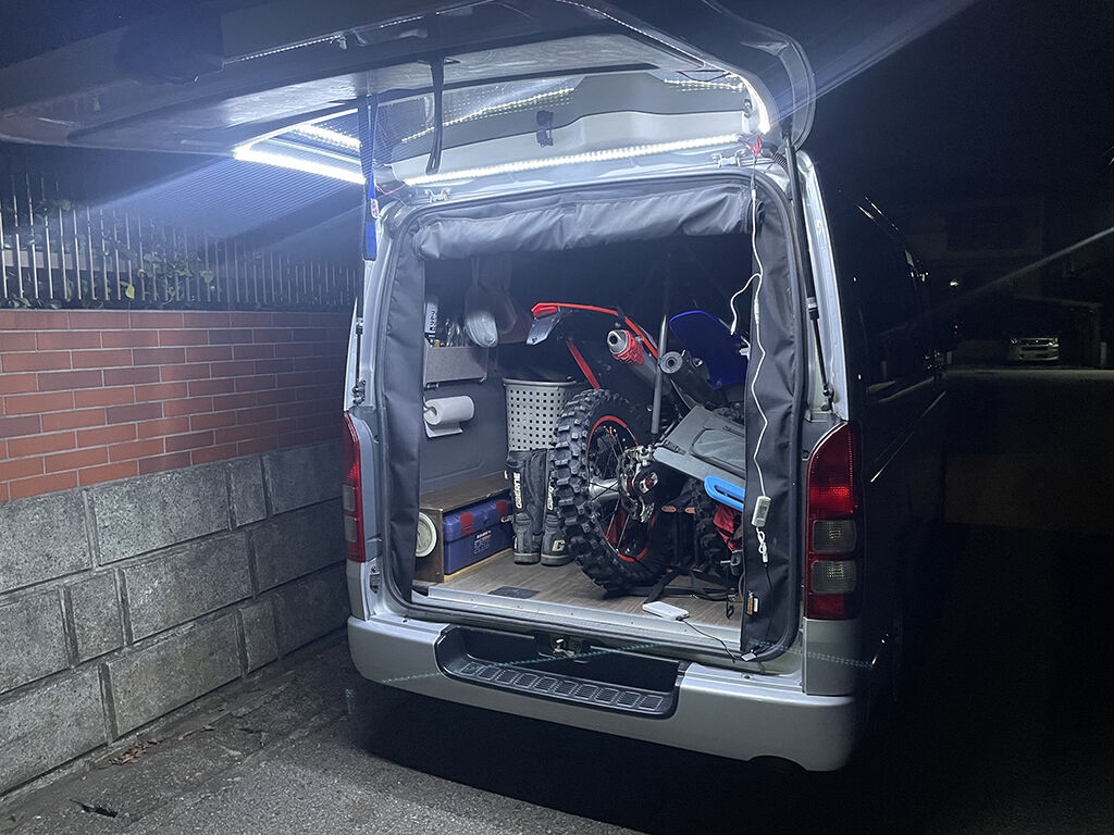 ルームランプではバイクを積む時に足元が見えにくかったのが、今回テープライトを仕込んだ事で、足元もかなり見易くなりました。夜間における積み下ろしや作業が、相当便利になりました。