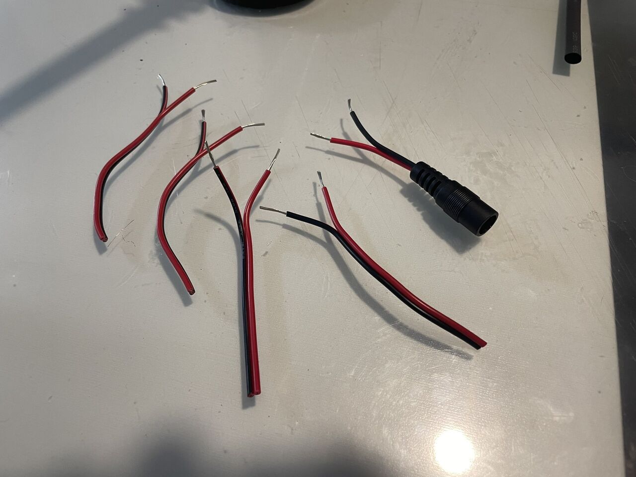 いろいろ結構紆余曲折があった訳ですが、最終的にはメスのDCケーブルを50mmでカットして、カットしたケーブルから100mmを4本取り、おのおのプラスとマイナスに30mmほど分けて10mmほど皮膜を剥き、プラスとマイナスの4本の電線をおのおの纏めて半田付けし、その上でDCジャックのケーブルのプラスとマイナスを半田付けしました。半田付けした部分は絶縁もしなければならないので、熱収縮チューブを使って絶縁しました。かなりゴチャった見た目ですが、分岐ケーブルを使うよりは軽く出来ました。