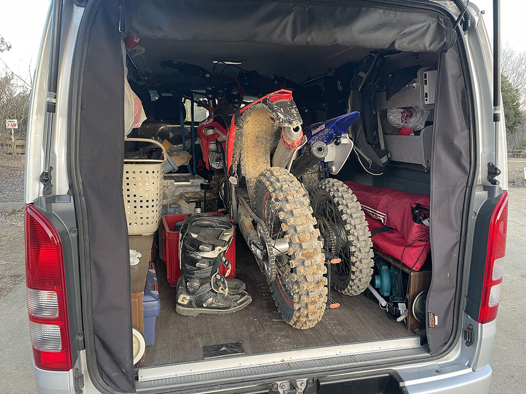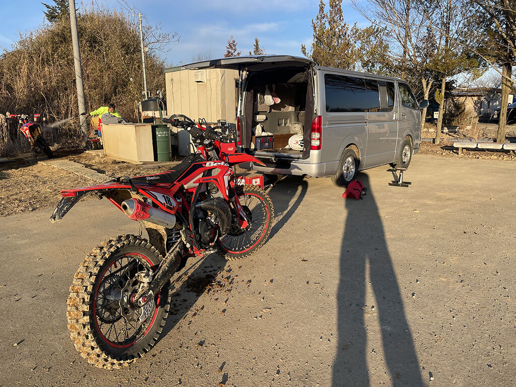 前の夕方に結構な雪が降り、道路も一部雪に隠れて、踏みしめられた部分は若干アイスバーンになってました。なので、早めに風呂を済ませ、食料も買い込んでパドックに復帰。夜はエンジンを掛けっぱなしにして寝ましたが、それでも若干寒い感じでした。聞けば、所によっては気温が氷点下だったそうです。ともあれ、翌日は良く晴れていい天気になりました。