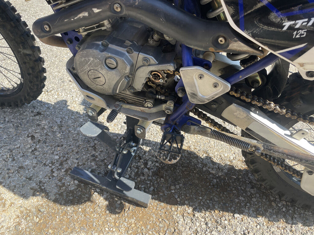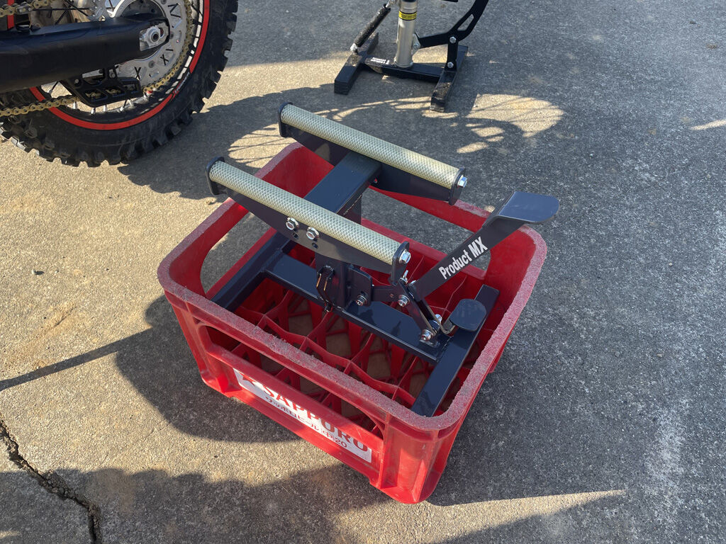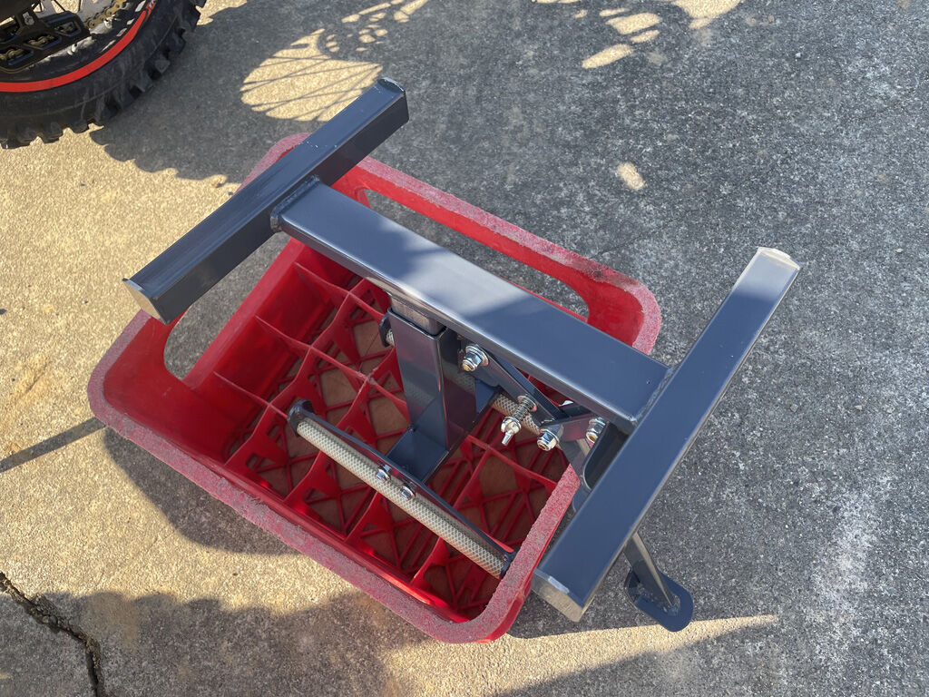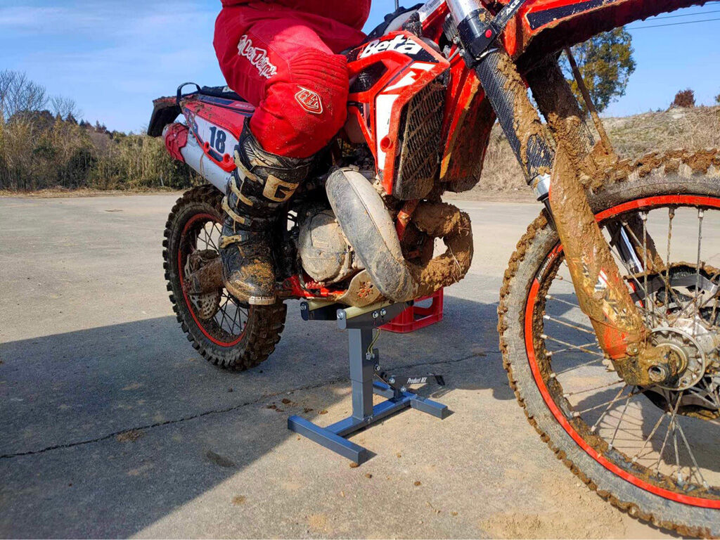 試しにクロトレの下に差し入れてリフトアップしてみました。天板、といっても、耐油ホースにカバーされた鉄棒2本が天板なのですが、これが一枚板の天板よりもエンジン基部に収まりが良い様で、滑ったりする感じがありません。エンジン基部にエンジンオイルのドレンがあるバイクなどは、結構便利なんじゃないでしょうか。クロトレにはエンデューロエンジニアリングのスキッドプレートを付けいますが、天板のサイズはそれよりも少し横にはみ出すくらいで、いい感じに載せる事が出来ました。もう一台、TT-R125の方は、軽く少し持ち上げるだけで、天板に載せる事が出来ました。つまり、フルサイズからミニモトまで、調整なしでオールマイティに使える感じです。