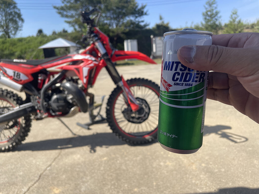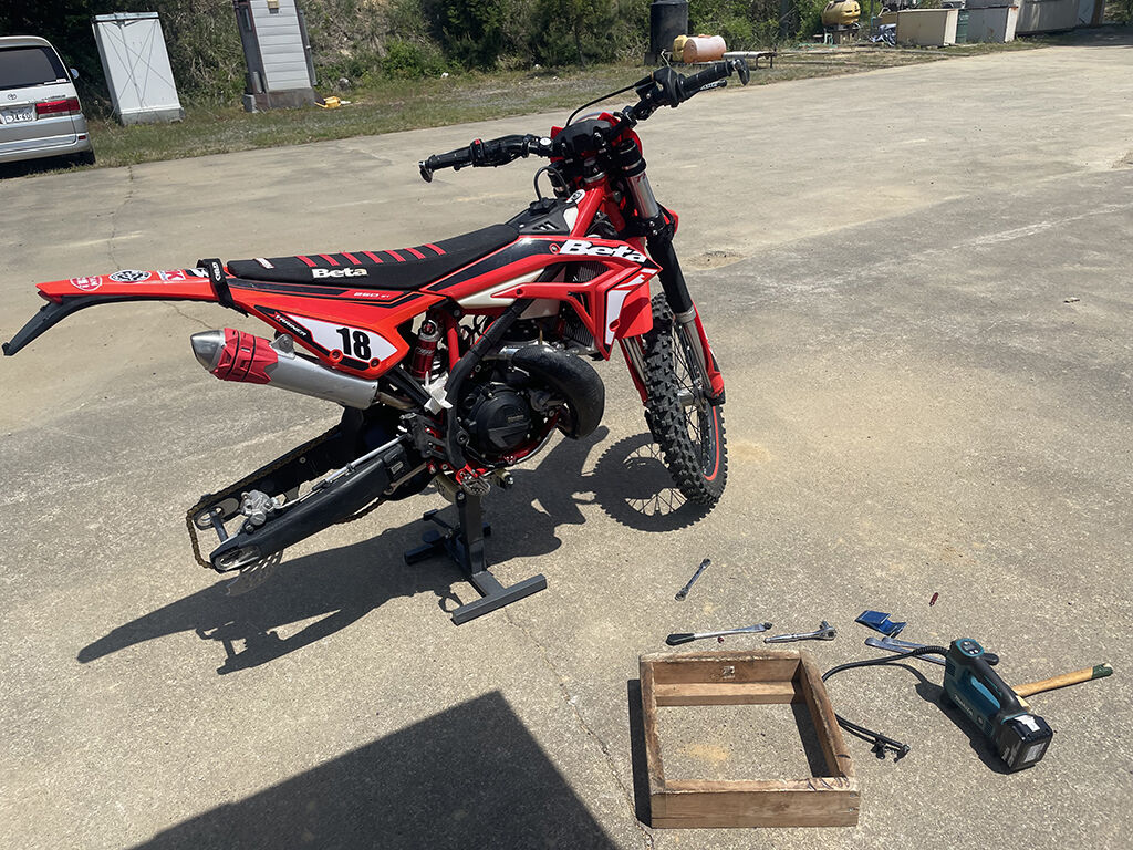 ともあれ走ってみて、南コースの還りのジャンプも軽く飛んでみましたが、やっぱりフロントが底突きます。なのでコンプを最強にしようと、一旦パドックに戻りました。ところが、スクールの先輩から「リア、パンクしてるよ!」と言われました。今朝、空気圧を調整した時は何ともなかったのに。去年の7月にもスクール始まった途端にリアがパンクした事がありました。