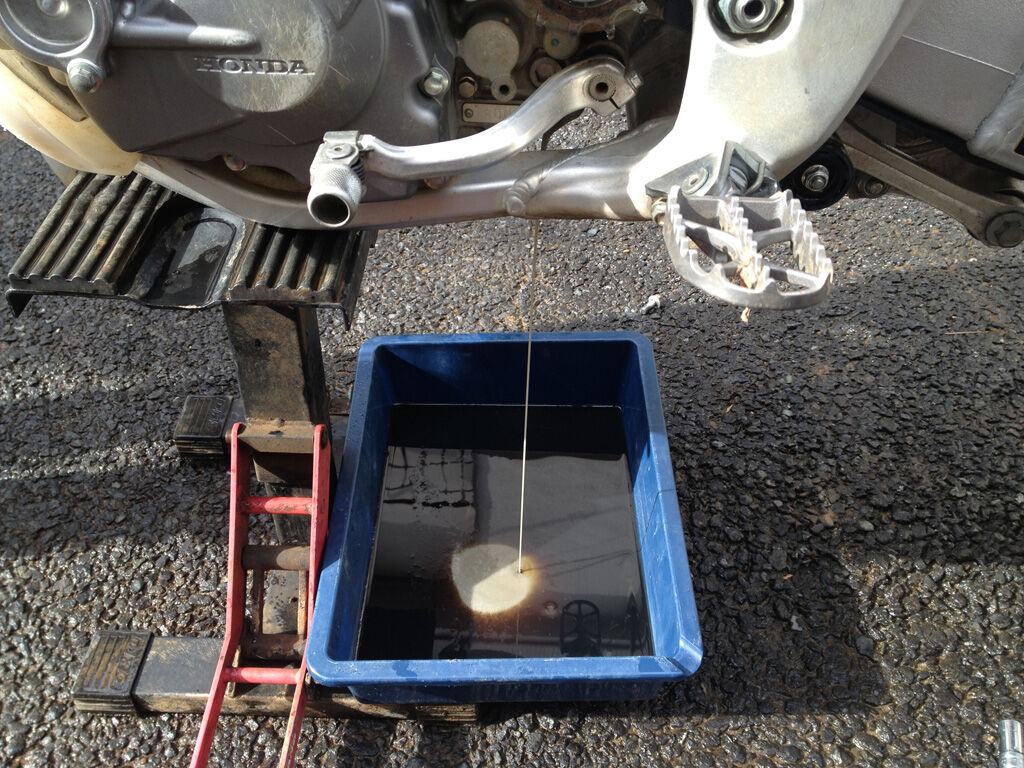 これで交換しています。4stの場合は、エンジンオイルとミッションオイルが一体になっているケースが多く、CRFなどは別体でしたが、まぁ3時間を目安に交換していました。2stの場合は、エンジンオイルは燃料に混合しますので、交換するのはミッションオイルという事になるのですが、使ってるのは4stのエンジンオイルと同じものです。