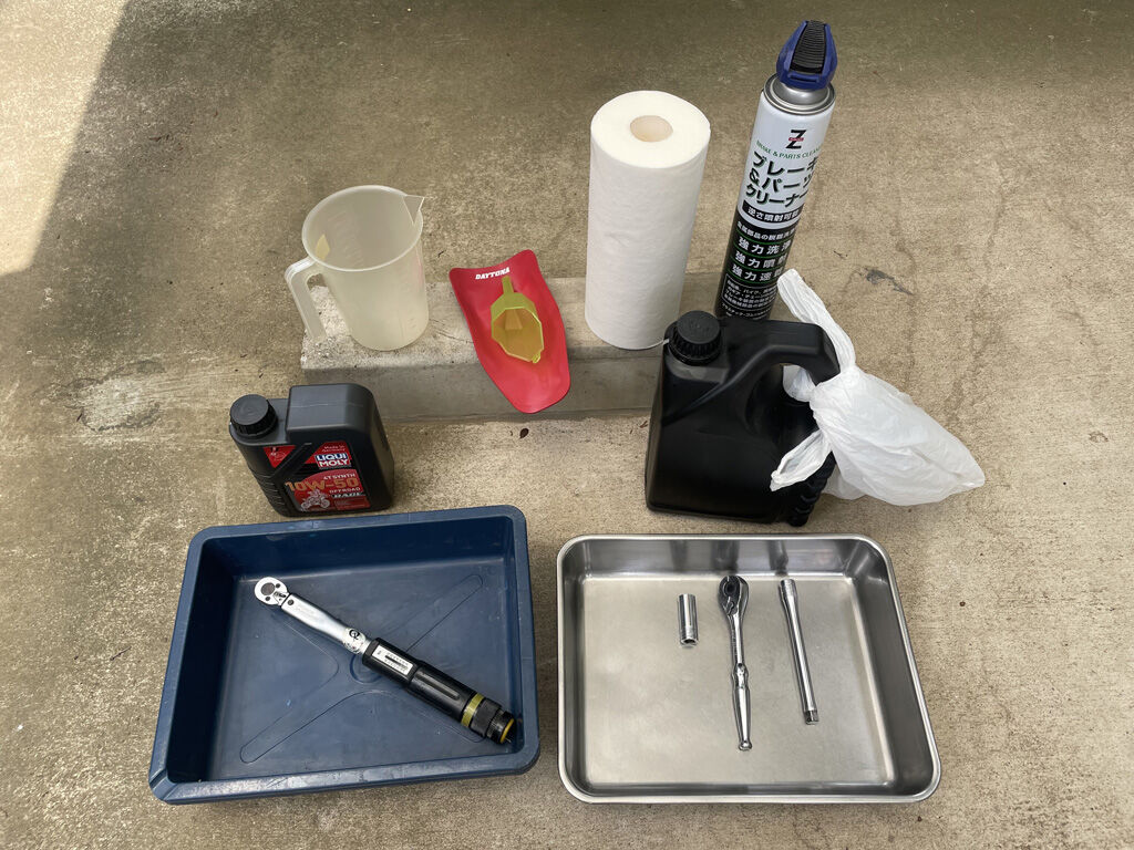 さて、本題です。オイル交換に必要な道具は、以下の通りです。